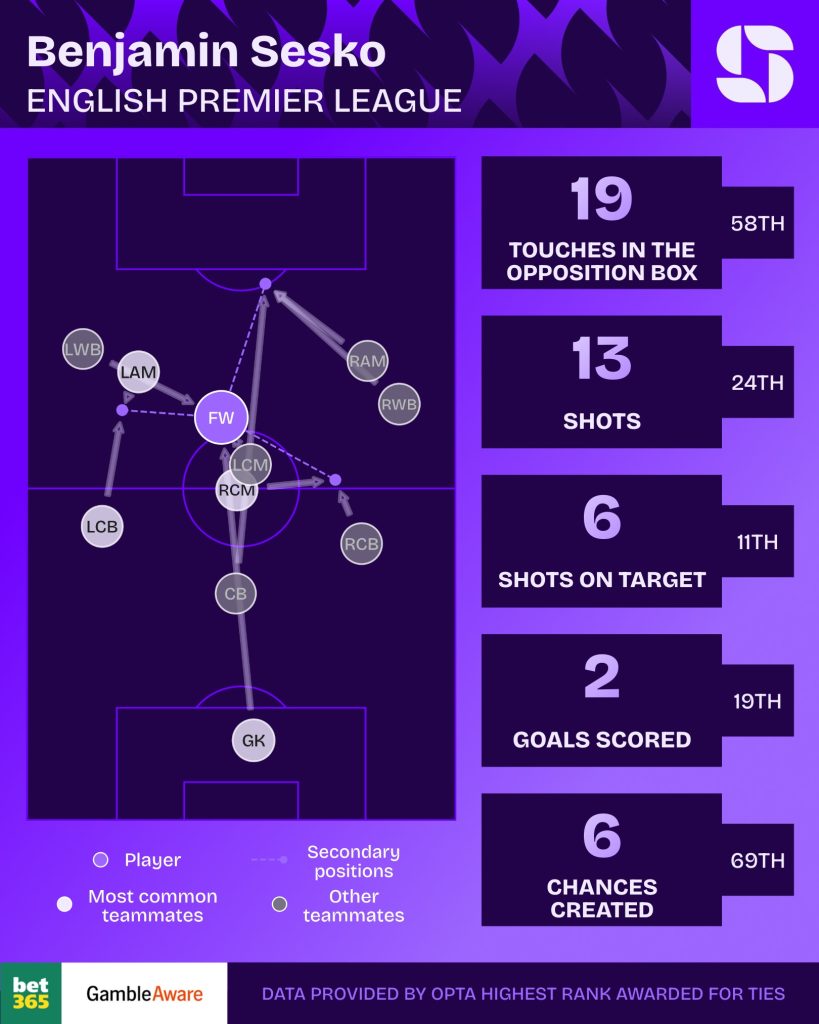 这位斯洛文尼亚前锋每90分钟赢得4.13次空中对抗,参与8.91次空中对抗,因此他的空中对抗成功率为46.3%。