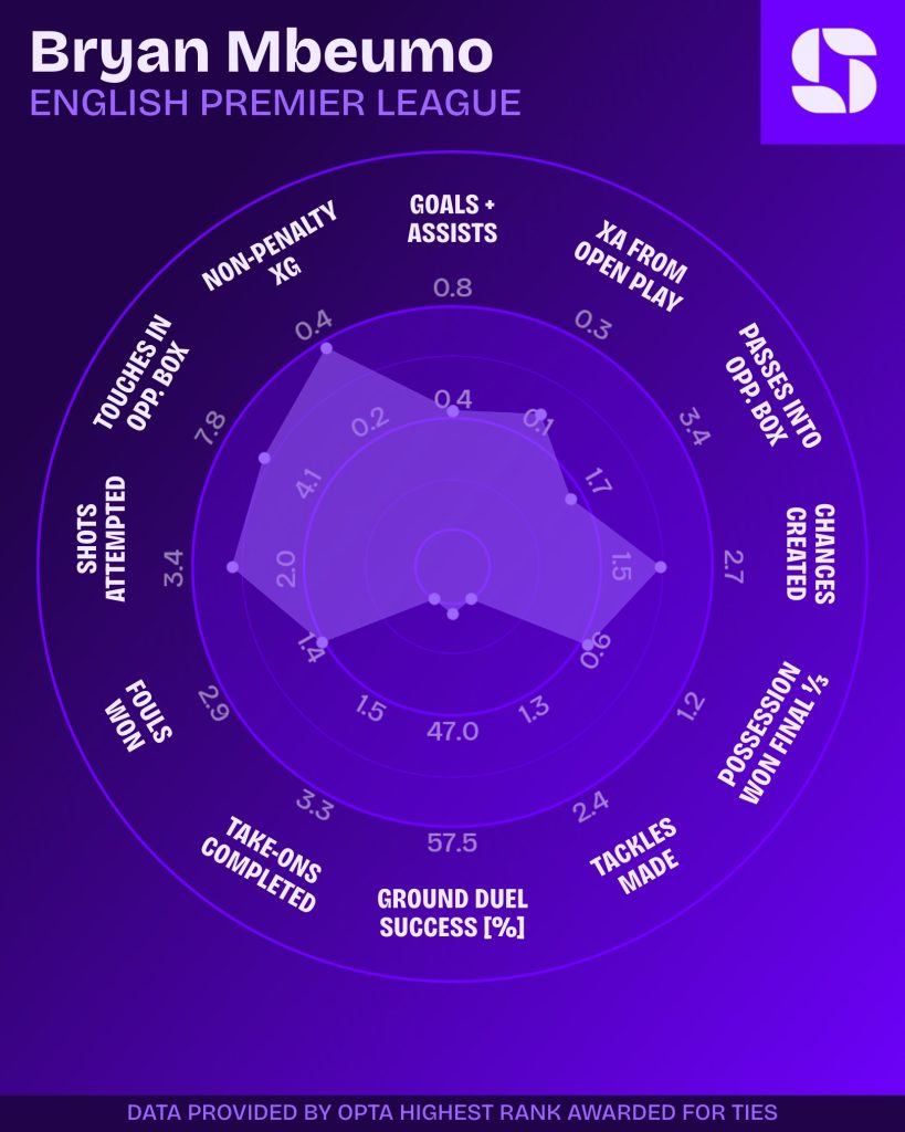 这让我们自然而然地想到了布赖恩-姆伯莫。这位26岁的球员在9次出场中已经打进3球,并且还有1次助攻。姆伯莫是阿莫林执教下的曼联队的主要进攻点,他为球队提供了纵向的进攻选择,他经常从对方后卫身后跑动,试图穿透对方的防线。
