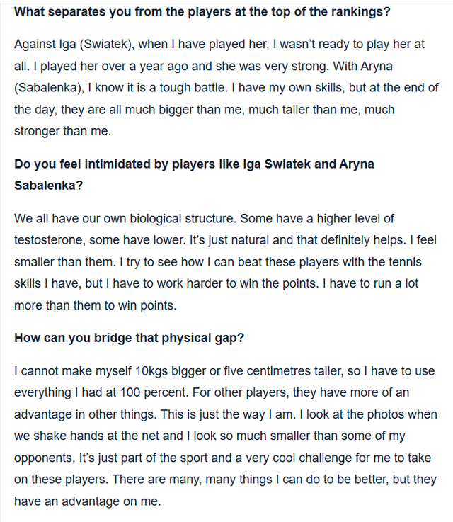 “她们都比我块头大得多,高得多,也强壮得多。我感觉比她们更娇小,我要想办法用我的技术去寻找击败她们的方法,但必须付出更多努力才能得分。我没法让自己增重十公斤或者长高五厘米,所以只能事事做到百分百。这对我来说也是竞技的一部分,一种很酷的挑战。”
