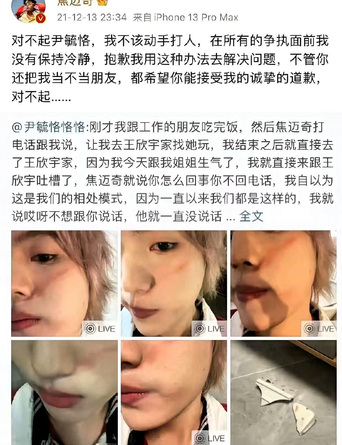 焦迈奇之前的瓜也被网友们找出来了, 网友们真是太厉害了, 21年的时候,焦迈奇的前女友曾经在社交媒体上发文称自己遭受过男方的打骂,同时还是晒出来了很多的照片。 这则旧闻重新浮出水面,像一颗埋在时间流沙里的炸弹,突然炸开了记忆的裂缝。网友们的考古能力总能颠覆想象,让尘封的剧情再度续写。 回溯2021年的那个夜晚,歌手尹毓恪曾在社交平台控诉被好友焦迈奇动手殴打。碎片划伤脸颊的照片触目惊心,碗碟砸来时险些伤到眼睛。这场冲突最终以双方删除贴文告终,却留下满地疑问。 当年焦迈奇迅速道歉:“不该动手打人,在所有的争执面前,我没有保持冷静”。但暴力留下的伤痕远比删帖速度更持久。娱乐圈的友情剧本里,从来不该有拳脚的戏码。 更值得玩味的是舆论场的分裂。有人谴责暴力行为,也有人质疑这是精心策划的炒作。在这个真假难辨的时代,伤痛常被解读成剧本,真相总在流量的漩涡中变形。 网络记忆如同潮汐, periodically冲刷着海岸线。今年春天,焦迈奇因外形变化再度引发讨论,而旧日争议也随之复活。这种循环提醒我们:互联网从不会真正遗忘。 当私人纠纷变成公共议题,每个人都成了裁判。但情感纠葛的罗生门里,从来不存在非黑即白的简单判断。或许比起急于站队,我们更该学会尊重事实的复杂性。 各位读者你们怎么看?欢迎在评论区讨论。
