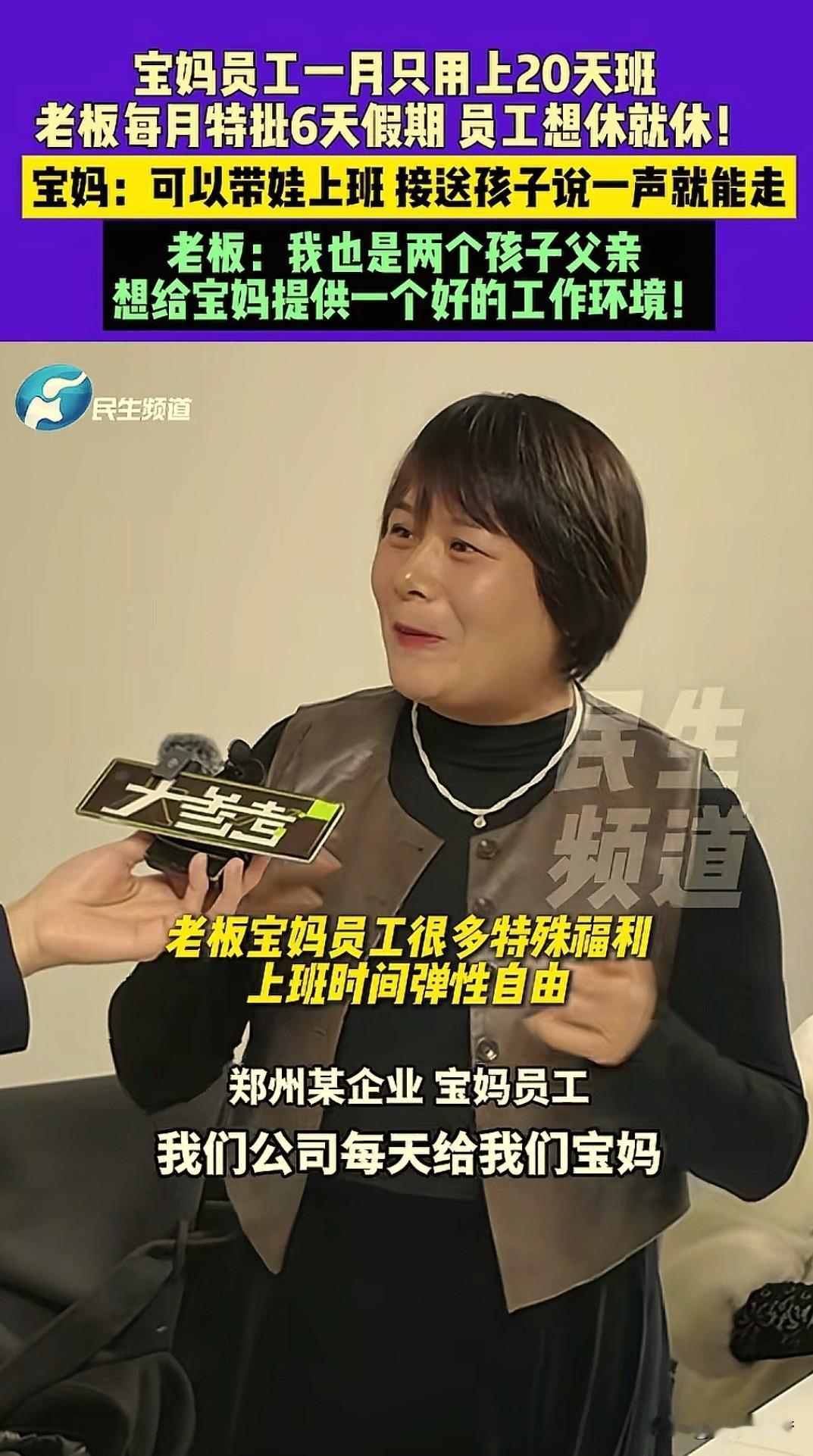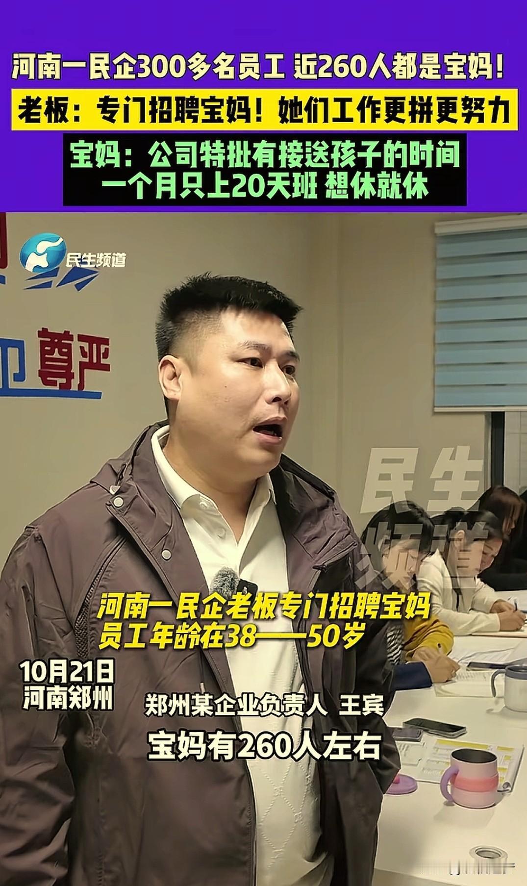 河南郑州,一男子经营一家冻货企业专门招聘女工,全厂300多名员工有260名宝妈,女工们不但有公司特批接送孩子的时间,并且一个月只需要上够20天班就可以。男子:我也是两个孩子的父亲,想给宝妈们 提供一个好的工作环境。 对于时间紧找不到合适工作的宝妈们来说,有这样一份工作,不但可以照顾到孩子,还为家里多了一份收入。 根据民生频道10月21日报道,这件让人感动又暖心事,就发生在一家企业里。260名女工和老板共同撑起了一个厂子,女工们不需要过多督促,她们将心比心,发自内心的认真工作。 男子王宾是这家企业的负责人,主要经营冻货产品,刚开始王宾并没有招聘宝妈的想法。而是在他有了两个孩子之后,他发现,家里人都出去工作,根本照顾不到两个孩子,并且外面的工作几乎没有在时间上适合宝妈的,这一经历,让他一下子理解宝妈们的不容易。 于是乎,厂子里除了必 须用男工的岗位,剩下的位置他几乎清一色的招聘38到50岁的宝妈来工作。 更让人意想不到的是,他不但不看重学历,还会给到每一名宝妈接送孩子的时间,工作时间弹性特别大,这一点在宝妈们看来,是在合适不过的工作了。 都说带孩子的妈妈工作家庭难两全,可王宾愿意把自己厂子里所有的岗位让给她们,让她们照顾孩子的同时,不脱离社会,还有一份稳定的收入。 更为难得的是,女工们知恩图报,厂子里的活,女工们干完手头的工作,经常自发帮助其他没做完的人,有人请假,会自觉的顶上去,同样自己接孩子时,别人也会主动过来帮忙。 有这样一团和气的员工,企业想不壮大都难。 当然王宾还做出了一个让所有宝妈赞不绝口的决定,他没有把利润的大头给到企业,而是把盈利的百分之85分给了所有员工当工资,有些岗位因此一个月能拿到过万的工资。 这么多钱,很多员工想都不敢想,对于她们来说,努力工作就是对企业最 好的回馈。 这样的企业何愁留不住员工?哪个员工又会偷懒呢? 有人说:这样的老板就应该多多挣钱,老板其实也很聪明,往往35以上的宝妈是非常珍惜自己的工作的,责任心重,也细心。 也有网友说:建议推广更多地区,居家带娃真的太需要一份这样的工作了,既能顾家,又能赚 钱,其实很多时候不是不出去工作,而是时间确实太紧张了!
