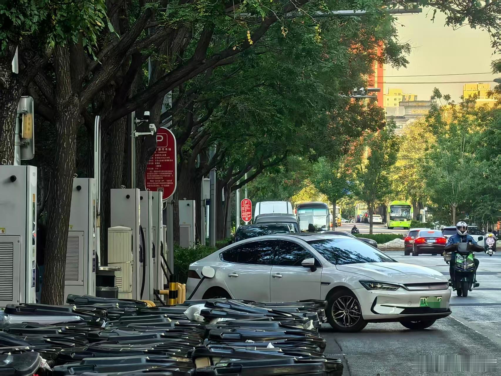 北京有很多路边国网充电桩+正规车位+停车电子计费,有些人为了避免电子计费,把车斜着停,同时把非机动车道完全占满。