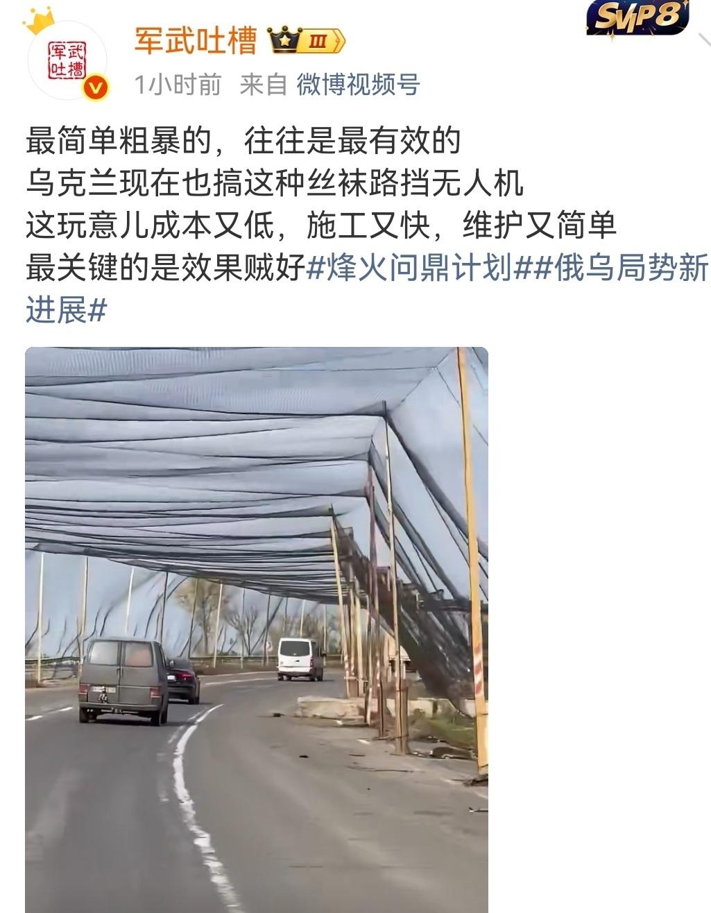 无人机的世界,必须加个罩子。 (图一)乌克兰在重要的能源设施上,加装反无人机安全笼,简单、粗暴但有效。 (图二)乌克兰在重要的道路上也加装丝袜网,也能有效地防范无人机,成本超低,施工和维护还都简单。 在当今无人机统治的世界里,无人机魔高一尺,万物必须加个罩子,罩子高一丈。