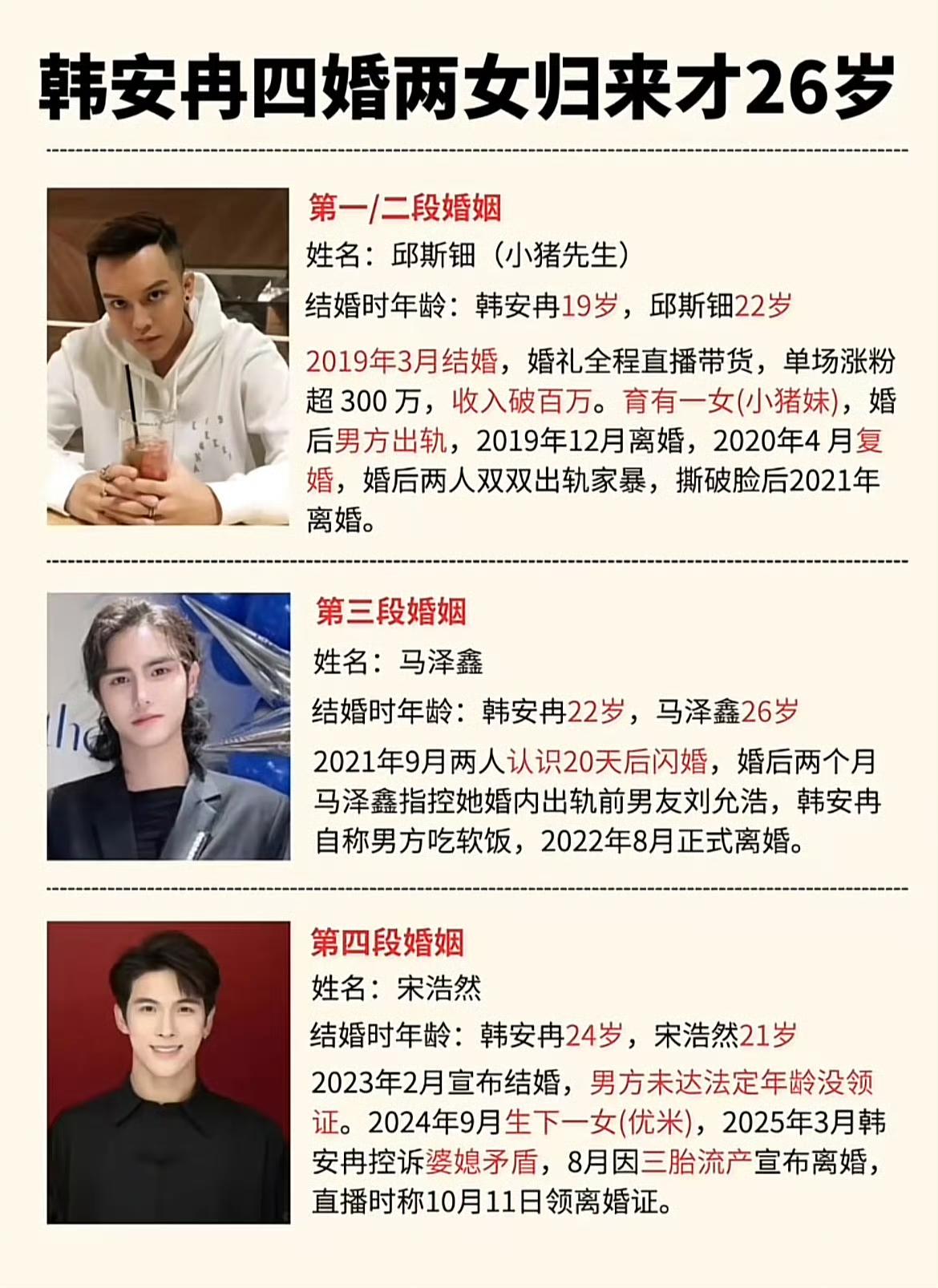 韩安冉表示,网上很多人都在猜测她是否会迎来五婚。对此,她称暂时不会,自己并非那么热衷于结婚,如今多少有些厌烦了。 韩安冉还提到,她和宋浩然一两天就会见面,除了没住在一起,和没离婚没什么差别。韩安冉历经四婚三离,育有两娃,可她不过才25岁。老公换了一个又一个,她却始终是那个韩安冉。说实话,韩安冉都能转型当结婚测评博主了,网红圈也由此开辟出一条新赛道:结婚博主。她有过四次结婚经验,若五婚想必更有心得,都能开班授课了。发展到现在,这事已经变得有些滑稽。至于为何会演变成这般模样,我认为和她的婚恋观脱不了干系。 韩安冉感情