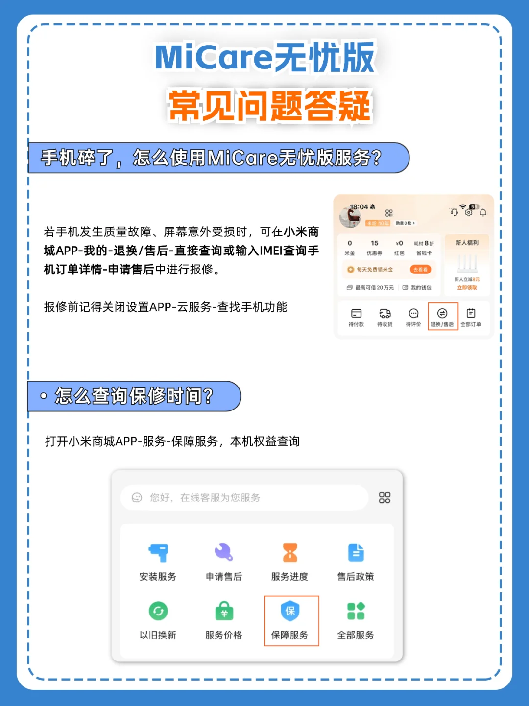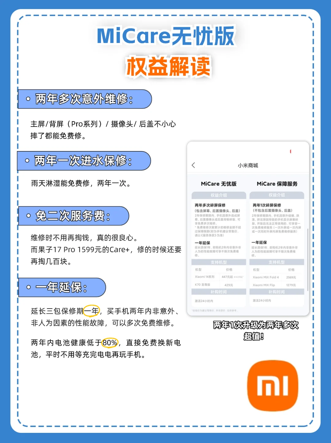 MiCare⽆忧版是⼩⽶官⽅推出的⼀款针对⼿机、平板等设备的保障服务,主要为⽤⼾提供更全⾯的售后保障。