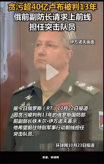 因贪污获刑的俄前副防长请求上前线头号创作者激励计划古今中外对军人罪犯都有戴罪立功的说法,让因犯罪被判刑的人到前线杀敌,如果壮烈殉国可以洗涮罪行,如果立功没死可以免除罪责。但前提是军人罪犯要经得起考验,要确实有上战场拼命的意志,不能借上战场的时候找机会逃跑,更不能拿起武器反戈一击甚至煽动部队投敌。俄罗斯国防部前副部长铁木尔·伊万诺夫因贪污超40亿卢布,被判处13年监禁,不知道有没有真正认罪伏法,值得信任吗?估计俄罗斯相关部门会认真评估,不会随意而为。