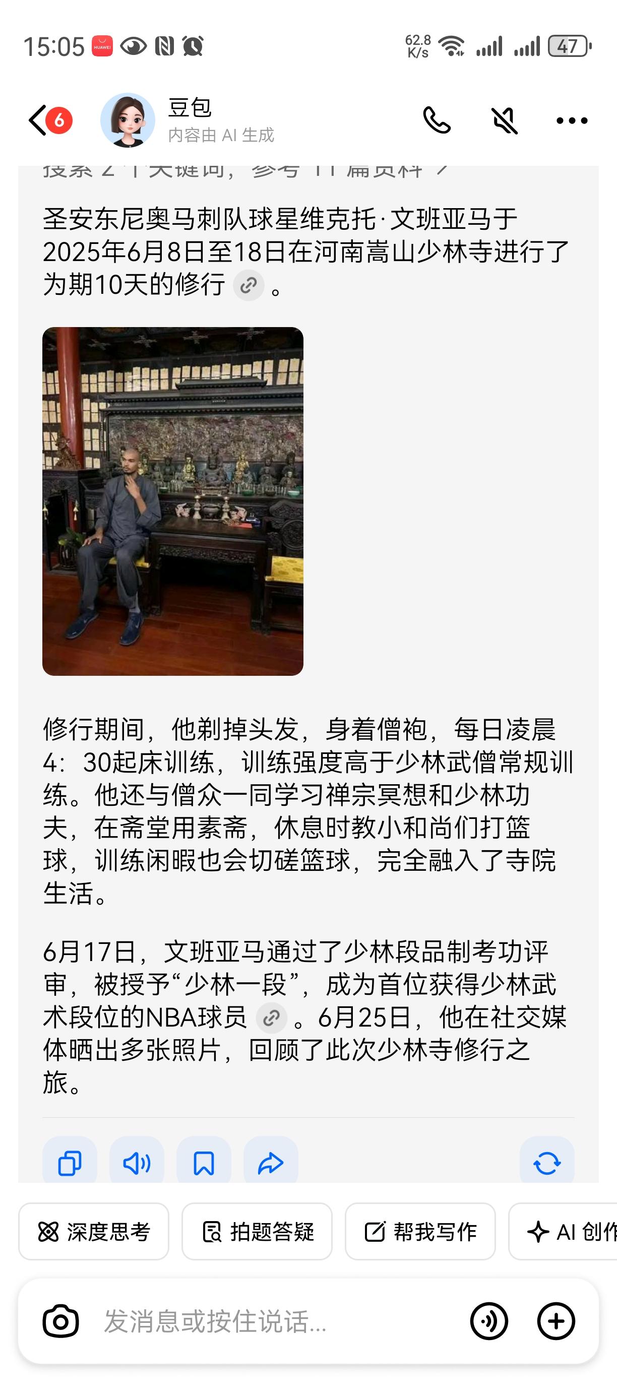 少林一段弟子横少NBA新科状元 马刺球星文马, 今年来河南嵩山, 潜心学艺, 获得少林一段弟子少林传承人 回到NBA大杀四方, 把新科状元和老状元浓眉, 干的人仰马翻[祝福][强] 太厉害了, 少林功夫[强]少林职业 杨瀚森, 要配合少林高僧去指导少林 [呲牙][呲牙][呲牙]