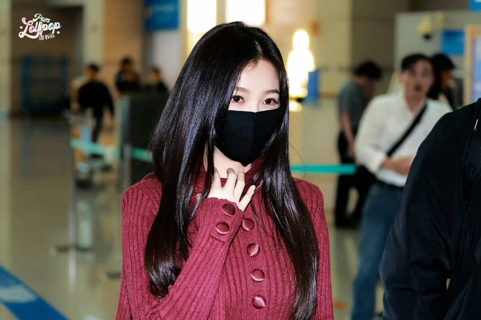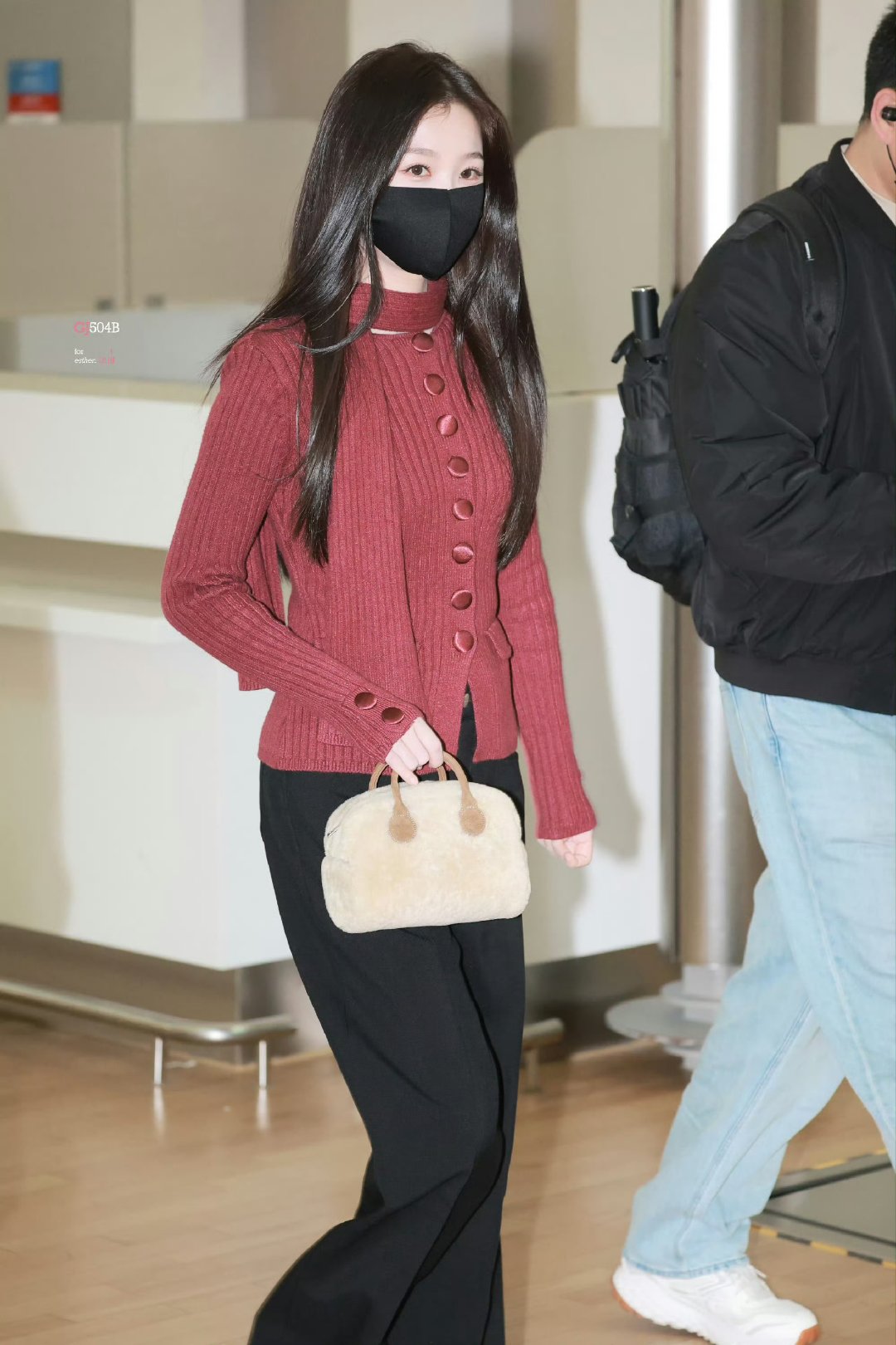 虞书欣红毛衣look首尔机场焦点锁定虞书欣!红毛衣造型温柔时髦,饭撒超暖心