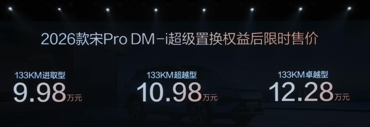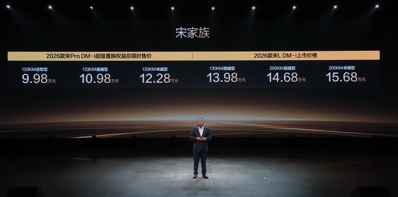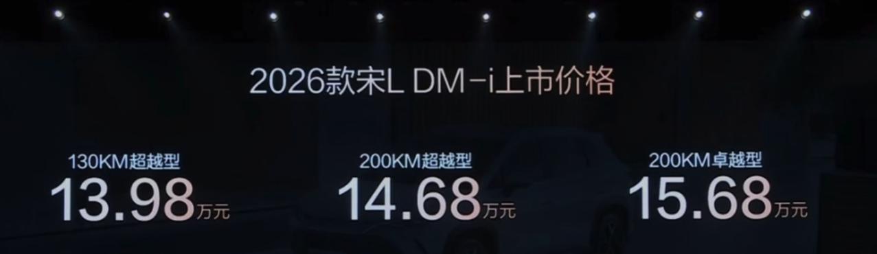 2026款宋L DM-i、宋Pro DM-i、秦L DM-i发布,覆盖9.98万至15.68万元区间。