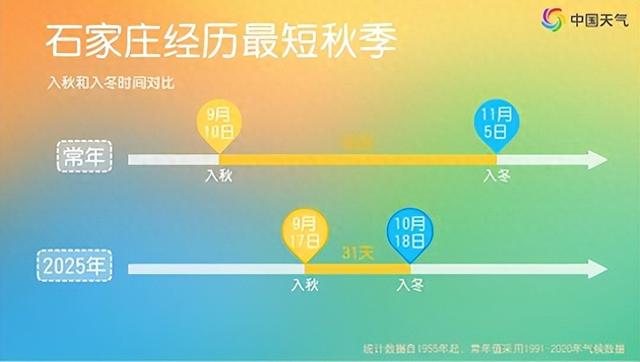 很多人觉得今年北方的秋季很短,主要是因为秋雨多,秋高气爽的日子少,而且冷得提前,冬季进程快速推进,华北多地秋季长度只有1个月左右。像河北石家庄,今年9月中旬入秋,10月中旬入冬,再加上时不时下雨,秋季只有一个月出头的时间,秋高气爽的体验也大大缩水。