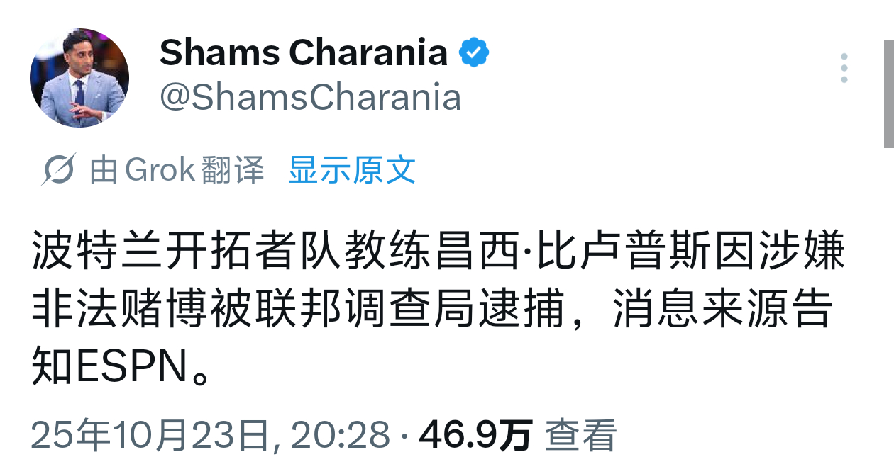 波特兰开拓者主教练昌西·比卢普斯因涉嫌非法赌博被逮捕,两名高级执法官员表示,此事与他执教的比赛无关。