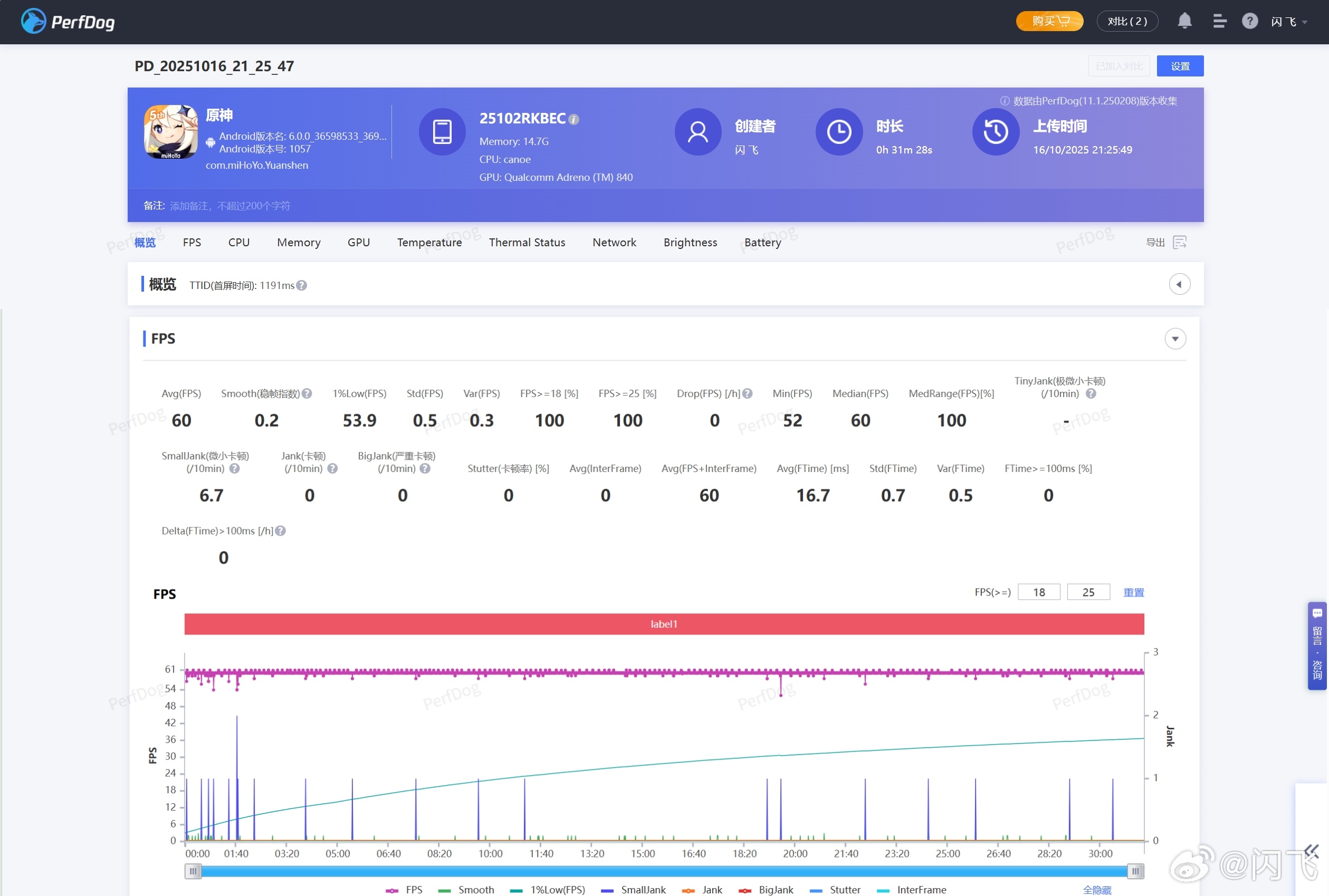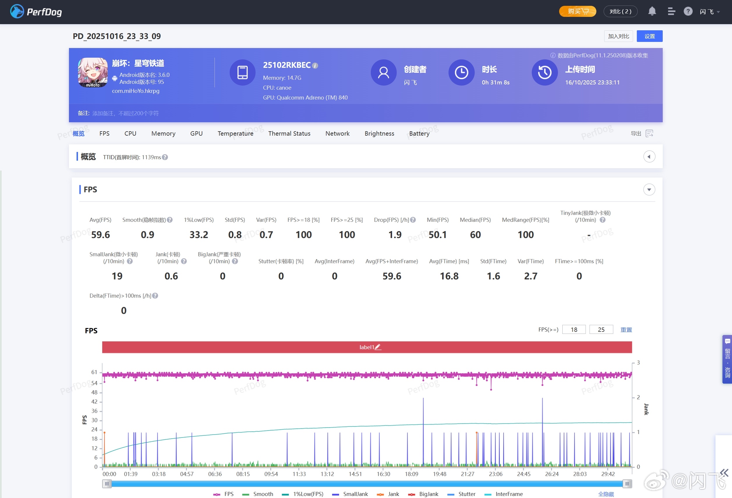 性能这方面,第五代骁龙8至尊版以外,还搭载了一颗AI独显芯片D2,带来了硬件AI超分和自研动态插帧。废话不多说了,直接通过腾讯PerfDog实测,《原神》璃月港跑图半小时,平均帧率60帧,全程没有什么明显的帧率波动,1%Low帧达到了53.9,而在《崩坏:星穹铁道》星槎海中枢,跑图半小时平均帧率59.6,仍旧满帧运行,Redmi K90 Pro Max可以轻松驾驭主流大型游戏。