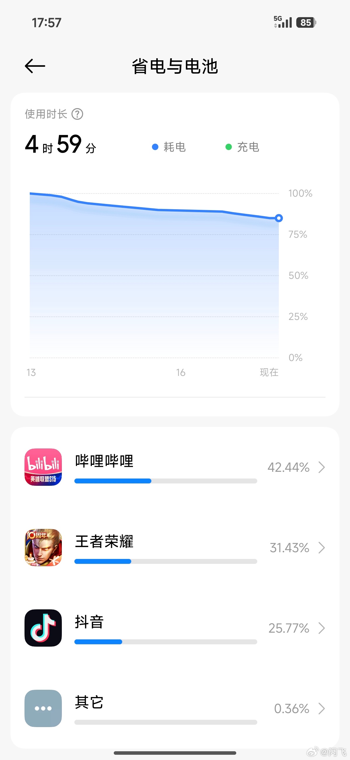 搭载的7560mAh小米金沙江电池,做了个续航测试,屏幕亮度设定50%,一小时极致画质120帧王者荣耀+一小时短视频+一小时在线1080P视频,亮屏三小时后剩余电量85%,简直就是“些许风霜”。充电方面100W有线+50W无线,安排上了22.5W有线/无线反向充电,值得一提的是,有线充电兼容了100W PPS,充电兼容性真心不错,有多个设备的兄弟出门不用带几个充电头了。