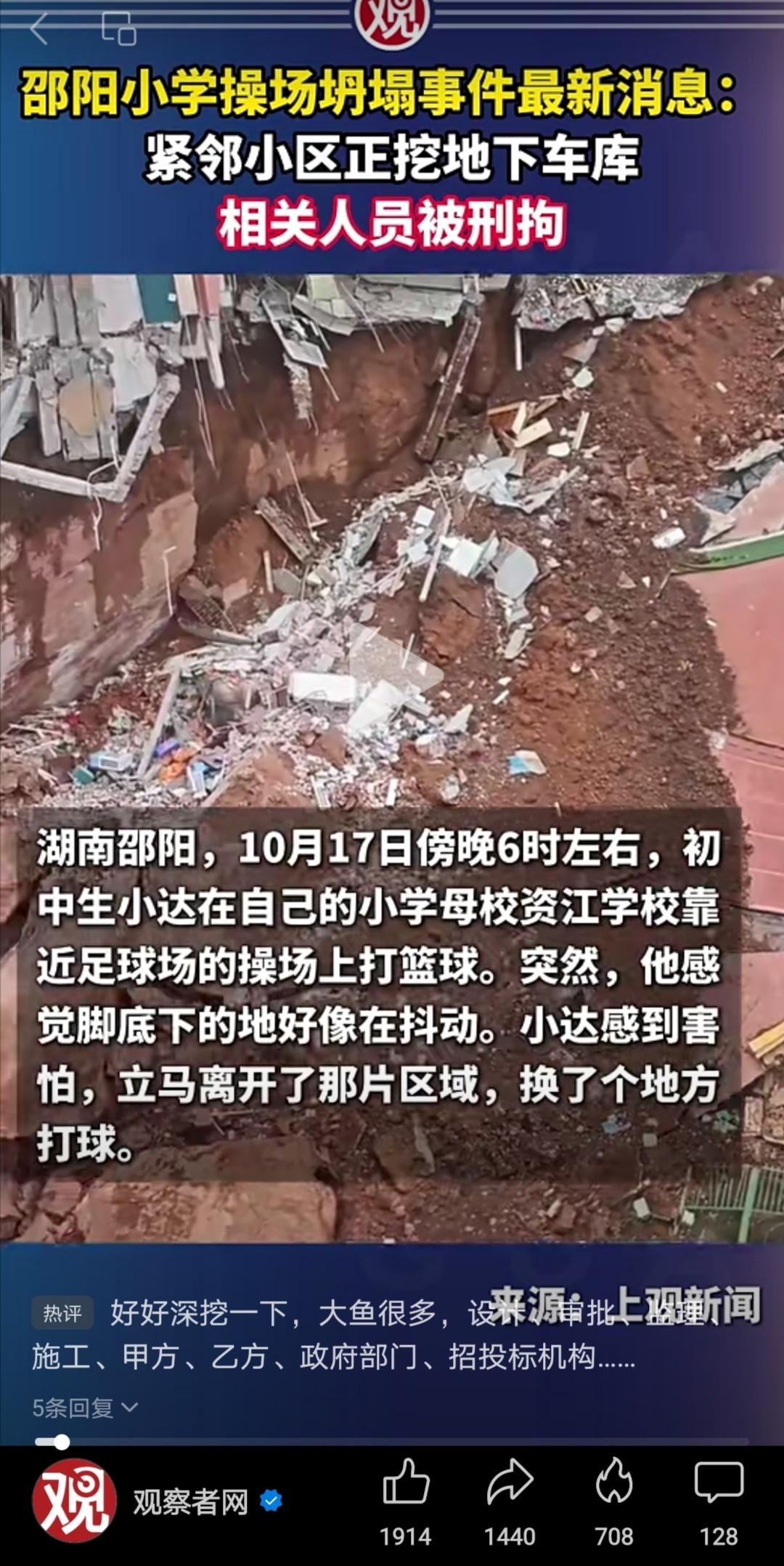 邵阳小学操场坍塌! 不幸中的万幸,没有人员伤亡。如果当时有学生在上体育课,那后果将多严重。学校作为人员密集场所,周边所有施工都要提升到最高防范级别,更别说违规施工了,像这种触犯安全红线的,建议要严肃处理。