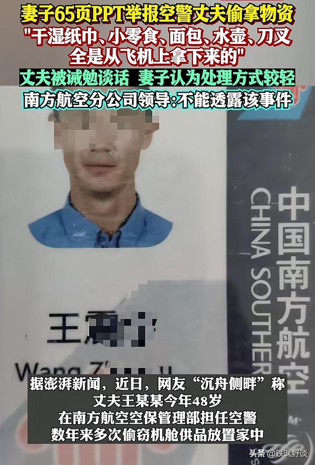 这算是大义灭亲吗?女子用65页PPT举报空警丈夫! 不过看举报的内容倒是让人有点匪夷所思,感觉这名女子真是那种不以恶小而为之,嫉恶如仇之人。 她觉得自己的丈夫在南航当空警的时候,习惯性的顺手牵羊,从公司把很多东西带回了家,有茶杯、刀叉、纸巾、小零食等。 虽然看上去没什么值钱的,但这名女子依然决然的去举报对方,而且辛辛苦苦做了65页PPT,并且当公司对自己的丈夫诫勉谈话后,她觉得处理方式太轻,无法接受。 不过在敬佩女子高尚情操外,想必很多人会有疑问,自己的老公偷拿单位的东西肯定不是一天两天了,既然嫉恶如仇,为什么之前不举报阻止呢?实在让人费解!