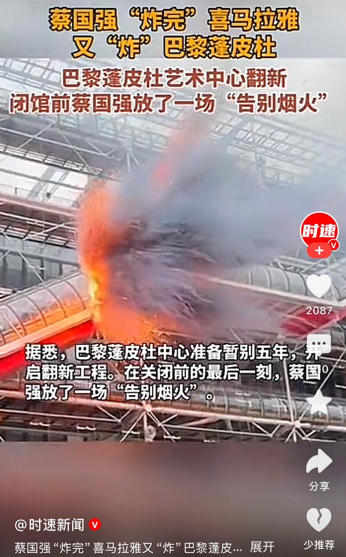 谁能想到啊! 总爱用火药搞大动作的蔡国强, 突然不琢磨新点子,也不四处跑活动了, 因为他在巴黎蓬皮杜闭馆前,搞了场叫《最后的狂欢》的白天烟花秀,说是要给这个要翻修五年的艺术地标好好告个别。 这烟花秀把蓬皮杜外墙当画布,传统火药和现代科技混一块儿,按理说该挺浪漫,结果炸开后黑烟弥漫,蓬皮杜都被烟雾罩住了,现场有人吐槽像火灾,还有人举牌抗议。 真的搞不懂这烟花秀的意义到底是什么,真的是我不懂艺术吗?