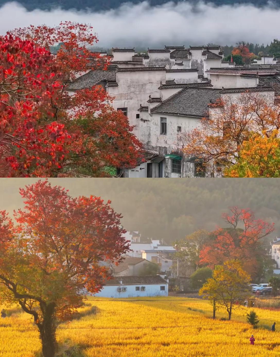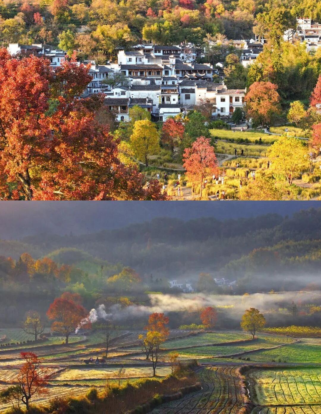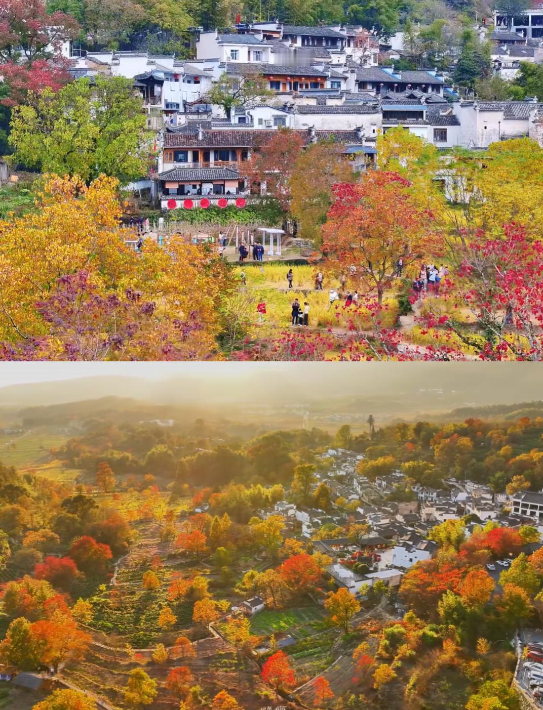 一卷秋风,一夜新凉,又到一年绝美赏秋时。 如果秋天只能去一个地方,那么我会选安徽塔川。 有一句话叫“塔川归来不看秋”,藏在皖南大山里的塔川小村, 一到秋天的真的是名副其实的画中古村,还被称为"中国三大秋色之一"。 白墙黛瓦的徽州古民居、马头墙、砖木石雕点缀在五彩山林之中。 清晨的薄雾中,炊烟袅袅,形成一幅活生生的“秋日民居画卷”,美得令人窒息。 11月初至11月中旬是最佳观赏期,村口观景台和阶梯田埂是拍红叶的好地方。