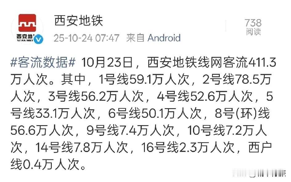 昨日10月23日星期四,西安地铁线网客流量411.3万人次,客流量表现情况稳定。 8号线环线客流量56.6万人次,再次超越了地铁3号线的56.2万人次,客流量单线排名第三。 9号线、10号线、14号线这些郊区线路客流量仍然低于单日十万人次的客流。