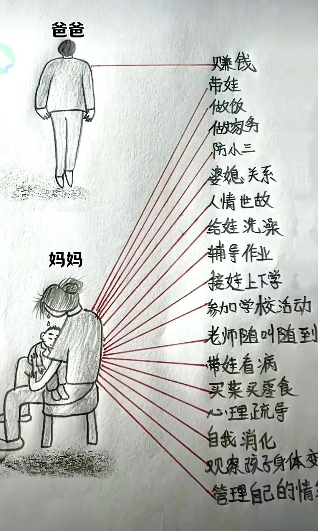 其实作为一个男人,看了下面这张图,确实感慨良多。 现在的女人,确实承担了很多的压力,像一个全能战士。 特别是在现在的教育机制下更是如此。 女人不仅要承担作为成年人的责任, 还要承担更多的社会责任。 对于一些知识水平不高的女性, 光是每天辅导孩子的教育, 都是一件很让人崩溃的事情, 更不要谈还有很多女性要同时兼顾工作和家庭。 在这里只能说一句:辛苦了!