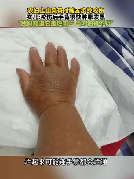 “悲剧还是发生了!”近日,浙江杭州,一女子上山采茶叶时,忽然感觉手被扎了一下,低头一看,有2个针头大小伤口正不断往外冒着黑血,拨开茶树还发现了一条五步蛇!女子被立即送往医院注射血清,手背已经肿胀发黑。网友:五步蛇俗称“烂肉王”。     李大姐(化名)干茶叶这行好多年了,村里人都叫她“老茶娘”。     那天早上五点多,天刚亮,她就背上竹篓出门。     山路有点潮,脚下踩着碎石和落叶,她边走边琢磨着:“这几天太阳好,茶长得快,趁着嫩,今天得多摘点,能多赚点。”     走到路上还碰见熟人,两人还笑着聊了几句,说今天的茶叶品相好,估计能卖个好价钱。     手一伸过去刚摘到第一撮嫩叶,忽然“一疼,就像被针狠狠扎了一下。     “我当时还以为是树枝刮的,低头一看,手背上两个小孔正往外冒黑血。”李大姐回忆起来还后怕。     那血一股一股往下淌,顺着手指缝直滴地上。     她心里一惊,赶紧扒开茶树一看,旁边盘着条胳膊粗的大蛇,花纹黑褐分明,眼神阴冷。     “五步蛇!”她几乎是条件反射地喊出来。她在山里干了大半辈子,对蛇最怕的就是这一种,咬人不多,可一旦咬了,后果严重。     李大姐顾不上茶叶,左手捂着伤口,用采茶篮挡着手,往山下拼命跑。     等跑到山脚,她家人一看都吓傻了,手背肿得跟馒头一样鼓,皮肤发亮、发黑,连袖口都被血染透了。     家人赶紧找块干净布松松绑在手腕上,连忙开车往医院送。     一路上,李大姐的手又热又胀,疼得连说话的力气都没了。到医院时,医生一看就知道情况不妙:“这是五步蛇咬的,毒挺深。”     医生立刻给她打了五步蛇抗毒血清,又反复冲洗伤口排毒。     忙活了大半天,手背的肿才慢慢稳下来。     医生解释说,五步蛇的毒属于血循毒,会破坏血管和肌肉组织,严重的会把肉腐掉,所以被人叫“烂肉王”。     “幸亏送得快,再晚一点,可能真保不住手了。”医生感叹。     李大姐这才松了口气,盯着自己又黑又肿的手背,心有余悸:“真是命大啊,那黑血一直往外冒,我都怕自己挺不过来。”   后来, 李大姐赶到安徽祁门一家专门治蛇咬伤的医院。 外敷了中药,用烧得通红的银针在伤口周围轻轻扎开几处,让里面的黑血慢慢流出来,处理完后,又给她挂上了消炎的盐水,几瓶下去,人也没那么晕了,手背的肿胀慢慢有了点缓。 住了两天院,医生嘱咐她要多休息、注意清洁伤口,回家后每天换药,千万别碰水。   现在李大姐已经在家修养了。     医生说,每年四月到十一月都是蛇出没的高峰期,采茶、挖笋的人最容易碰上。     最常见的几种毒蛇,就是蝮蛇、竹叶青和五步蛇。     他叮嘱李大姐以后上山一定要穿长袖衣裤、穿高帮鞋,最好拿根棍子走在前面“打草惊蛇”。     “要是真被咬了,别乱跑,也别随便绑。记得蛇长什么样,最好拍张照,医生能更快配血清。”     不少网友看到这事后直呼“隔着屏幕都疼”,还有人留言说他们老家上山都随身带蛇药。     “五步蛇不是走五步就死,但毒扩散很快,半小时内不送医就麻烦了。”     李大姐苦笑着说:“以后上山一定全副武装,再也不敢大意了。这‘烂肉王’真不是闹着玩的,命比茶叶金贵多了。”     医生也借机提醒,眼下正是春茶旺季,茶农、采笋工上山前多留个心眼,遇到蛇别慌,别打也别跑,保持冷静、及时就医,大多数人都能平安康复。     可要是真拖了,那可真不是小事。     对此你怎么看?     信源:河池融媒教育频道