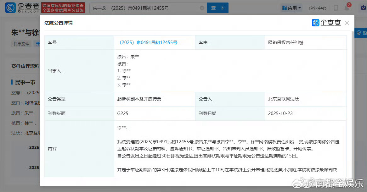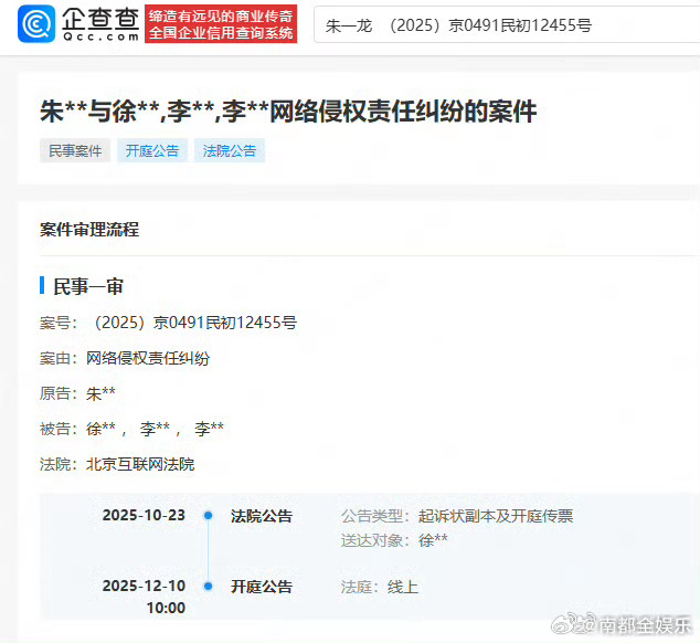 朱一龙起诉多人侵权据企查查APP信息,近日,法院刊登朱一龙起诉李某1、李某2、徐某某网络侵权责任纠纷一案起诉状副本及开庭传票。据悉,该案计划将于举证期满后的第3日,在北京互联网法院开庭审理。
