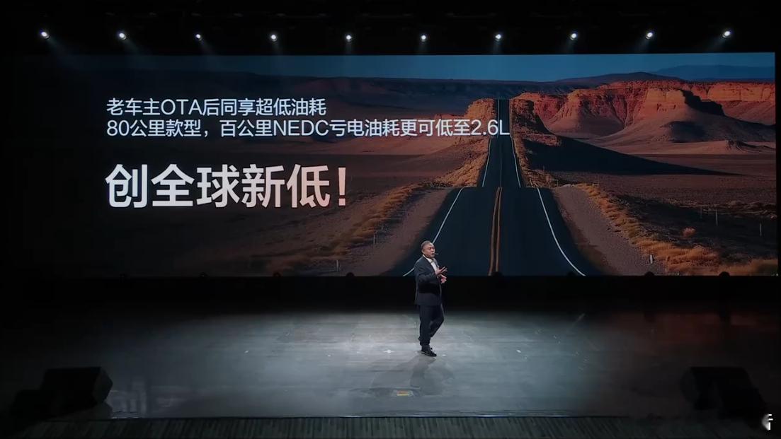 纯电续航增加至128公里,NEDC百公里亏电油耗仅2.79L,创全球新低,满油满电综合续航2148km;同时,老车主可以通过OTA,80km车型NEDC亏电油耗可低至2.6L/100km,工业奇迹再进化。