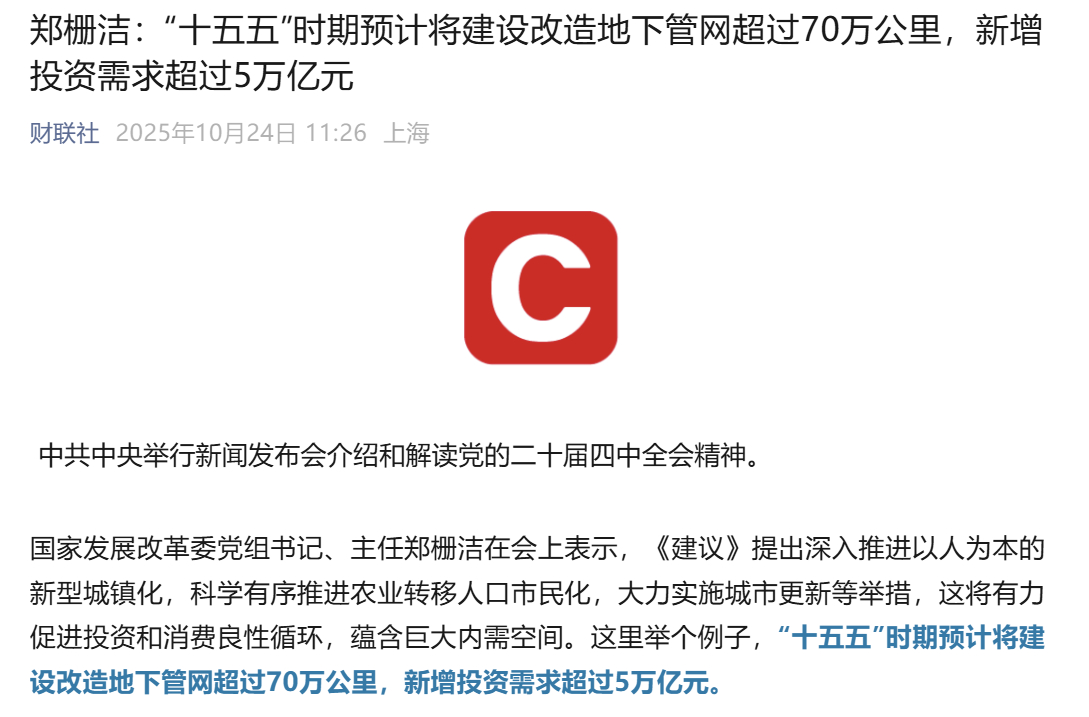 【“十五五”时期预计将建设改造地下管网超过70万公里,新增投资需求超过5万亿元】未来随着气候变化,极端天气的增多,城市给排水方面的压力也将随之骤增。比如今年夏天上海的几次瞬时强降雨就造成了许多路段的路面积水。地下管网的改造也是防患于未然。