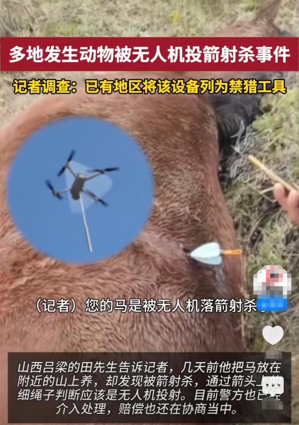 国内无人机闯祸了! 近日,有位山西吕梁的网友在网络媒体发布视频称,他自己养的马被热成像无人机投箭射杀,此事引起网友和公安部门的关注。媒体新闻记者主动联系到马主人田先生,他表示警方已找到肇事者,“他说本来是想射杀野猪的,错杀了家养的马匹。” 高科技本应该是服务于人类的,但是像这种损害老百姓财产,甚至威胁他人生命的,就应该立法予以监管了。俄乌战场上,无人机每时每刻都在杀害军人和平民,全球都应该尽快给予管控,不再让悲剧上演 你们觉得无人机该不该被严管呢? 大家都来聊一聊 .