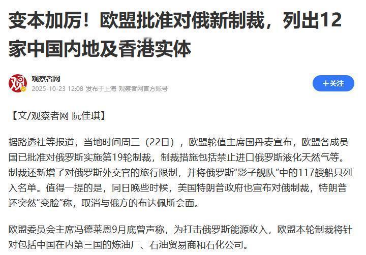 48小时风暴升级!欧盟挥出“核选项”重拳,冯德莱恩:12家中企只是开始 欧盟最近像是陷入了“多事之秋”的旋涡。美国的对华关税战硝烟未散,俄乌冲突还在持续“放血”,自家经济又一蹶不振。 就在这节骨眼上,欧盟突然拿出所谓“核选项”,把12家中国内地和香港企业拉进了对俄制裁名单。欧盟委员会主席冯德莱恩一句“只是开始”,让这场风暴的温度陡然升高。 欧盟的第19轮对俄制裁,本来是冲着俄罗斯去的,结果名单里却蹦出12家中国企业,包括两家独立炼油厂和一家贸易公司。 这看似意外,细想却透着逻辑。欧盟的说法很直接,指控这些企业帮俄罗斯“规避制裁”。这套说辞,近两年在西方媒体里几乎成了“标准答案”——只要和俄罗斯有点生意来往,第三国企业都得小心点,分分钟被当成“替罪羊”。冯德莱恩的表态,明显是要给中国企业敲山震虎。 但这里面的问题不只是名单本身。中国外交部已经明确反对非法单边制裁和“长臂管辖”。其实早在上轮制裁,中国就对欧盟两家银行采取了对等反制,表明维护自身利益绝不含糊。 更有意思的是,欧盟内部自己也没完全断了和俄罗斯的来往。像德国、匈牙利这些国家,能源还得靠俄罗斯撑着。嘴上喊着制裁,转身又在能源市场上继续买卖,这种“双标”操作,怎么看都有些说不出口的尴尬。 欧盟现在的日子确实不算好过。一方面,要应付美国的贸易压力。美国的《通胀削减法案》让欧洲不少产业喘不过气来,尤其是汽车和高端制造业。 另一方面,俄乌冲突拖得太久,能源价格飙升,欧洲老百姓的生活成本水涨船高。更要命的是,欧盟还得在关键原材料上指望中国,像稀土、锂这些玩意,欧洲自己根本玩不转。可欧盟偏偏在半导体、高科技领域对中国设限,嘴上说合作,行动上却处处防备。 这就像是想吃中国的蛋糕,还要把中国的手给捆上。不光如此,前阵子荷兰安世半导体事件闹得沸沸扬扬,欧洲芯片库存告急,一些业内人士甚至说,欧洲不少企业的芯片库存只够用两周。 一边喊着要和中国“脱钩”,一边又离不开中国的关键供应,这种自相矛盾的策略,怎么看都像是在高空走钢丝。 指望中国在稀土供应上“网开一面”,又想在政治安全上给中国上紧箍咒,这种“异想天开”,要真能成,那才是国际关系史上的奇迹了。 再看欧盟自己的经济底子。德国已经陷入技术性衰退,法国的信用评级也被下调。欧盟统计局的数据摆在那里,经济复苏乏力,内部矛盾不少。 这个时候硬要和中国“脱钩”,后果其实是自己先受罪。很多欧洲企业在中国市场赚得盆满钵满,像汽车、奢侈品这些行业,如果失去中国市场,日子绝对不好过。更别提中国稀土、锂等关键原材料的供应,一旦被掐断,欧盟的绿色和数字转型基本就得“熄火”。 中国这边的态度一直很明确,坚持和平合作,凡事以对等为原则。上轮银行反制已经给欧盟提了个醒,要是欧盟继续升级制裁,中国完全有能力采取更有针对性的反制措施。 比如对欧洲的农产品、高端制造业下手,这对欧盟经济来说,绝对是“釜底抽薪”。现在全球经济本来就一盘散沙,欧盟再这么折腾,说不定最后搬起石头砸了自己的脚。 欧盟这次挥舞“核选项”,看上去是杀气腾腾,实际上很可能是自伤八百的冒险。中国和欧盟的经贸联系早已你中有我、我中有你。制裁大棒挥得再狠,也很难真正切断这根纽带。 欧盟过去紧跟美国步伐,但经济未来却离不开和中国的合作。这种两难处境,让欧盟的每一步都像是在刀尖上跳舞。 48小时之内,欧盟一连串的决策,反映出一种焦虑和短视。把中国企业列为制裁目标,无疑是在玩一场高风险的赌博。这种做法解决不了俄乌冲突,也缓解不了芯片短缺,反而把全球经济的不确定性推得更高。 多边合作才是出路,欧盟要是真想走得远,摒弃零和思维,放下傲慢,才是正道。否则,这场风暴终究要让欧盟自己承担后果。 参考资料:变本加厉!欧盟批准对俄新制裁,列出12家中国内地及香港实体 2025-10-23 11:45·观察者网