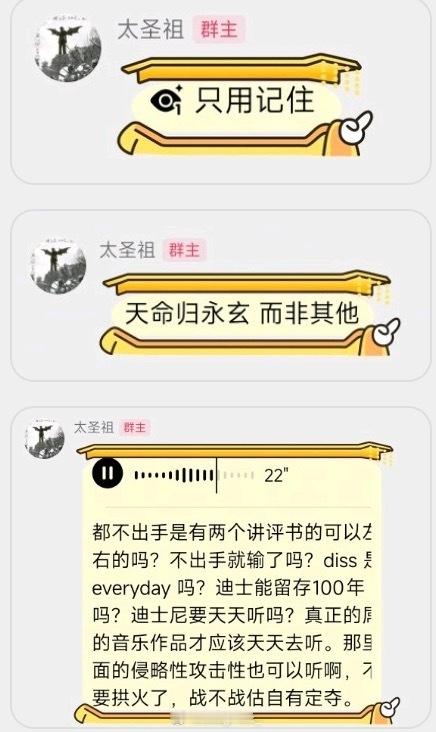 “不出手就输了吗?迪士能留存100年吗?迪士尼要天天听吗?真正的屌的音乐作品才应该天天去听,那里面的侵略性攻击性也可以听啊,不要拱火了,战不战估自有定夺!”