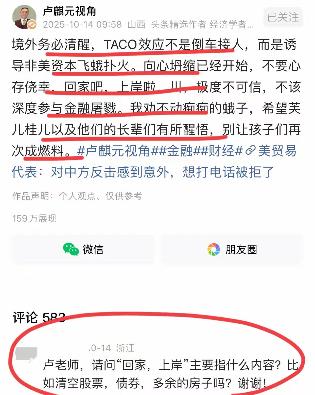 著名经济学家卢麒元的警示,千万不要飞蛾扑火!!他提醒说,国内的那些在境外的资本,千万要小心了,这可不是倒车接人,而是让你们飞蛾扑火!! 卢总反复在强调,美帝元崩溃已经开始了,这就是向心坍塌,美帝的大危机开始了~ 他再次呼吁,那些在国外的资本,赶紧下船上岸,赶紧回家来!!据卢总研究,川总是极度不可信的,不要再犹豫了,否则就是一场金融屠戮,悲惨的结局在等着你~ 怎么劝,好像他们也不明白,他希望这帮人长辈们能有所醒悟和察觉,千万不要让你们的孩子成为这场屠戮的养料!! 网友评论:他说的是美国通胀到了高点,然后我们国家通缩并没有被打败,然后美国支持不下去的情况下,美元全球崩溃,出现了美元危机,美国就会去收割全世界的外国资产来补充国内的窟窿,他说的话这个是事实,所以就要看和通胀还能坚持多久?说白了就是中国和美国现在目前的经济战,金融战到底谁输谁赢 这是个忠恳的建议,是为了让华人免受割韭菜的担忧,于卢来说他的建议没捞一分好处,但这么一个充满功德的善意提醒,却被某些居心叵测的人攻击,大家一定要擦亮眼睛,果断决策,尽量把损失降到最低。