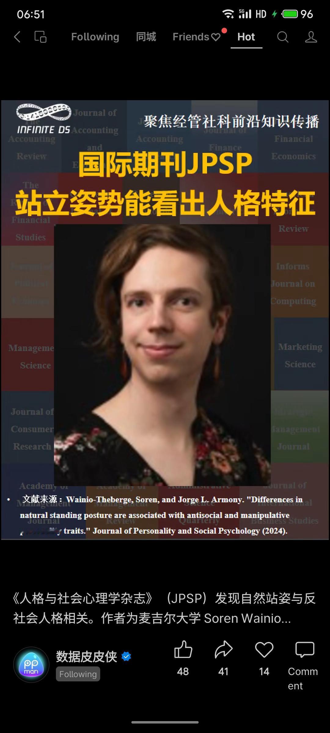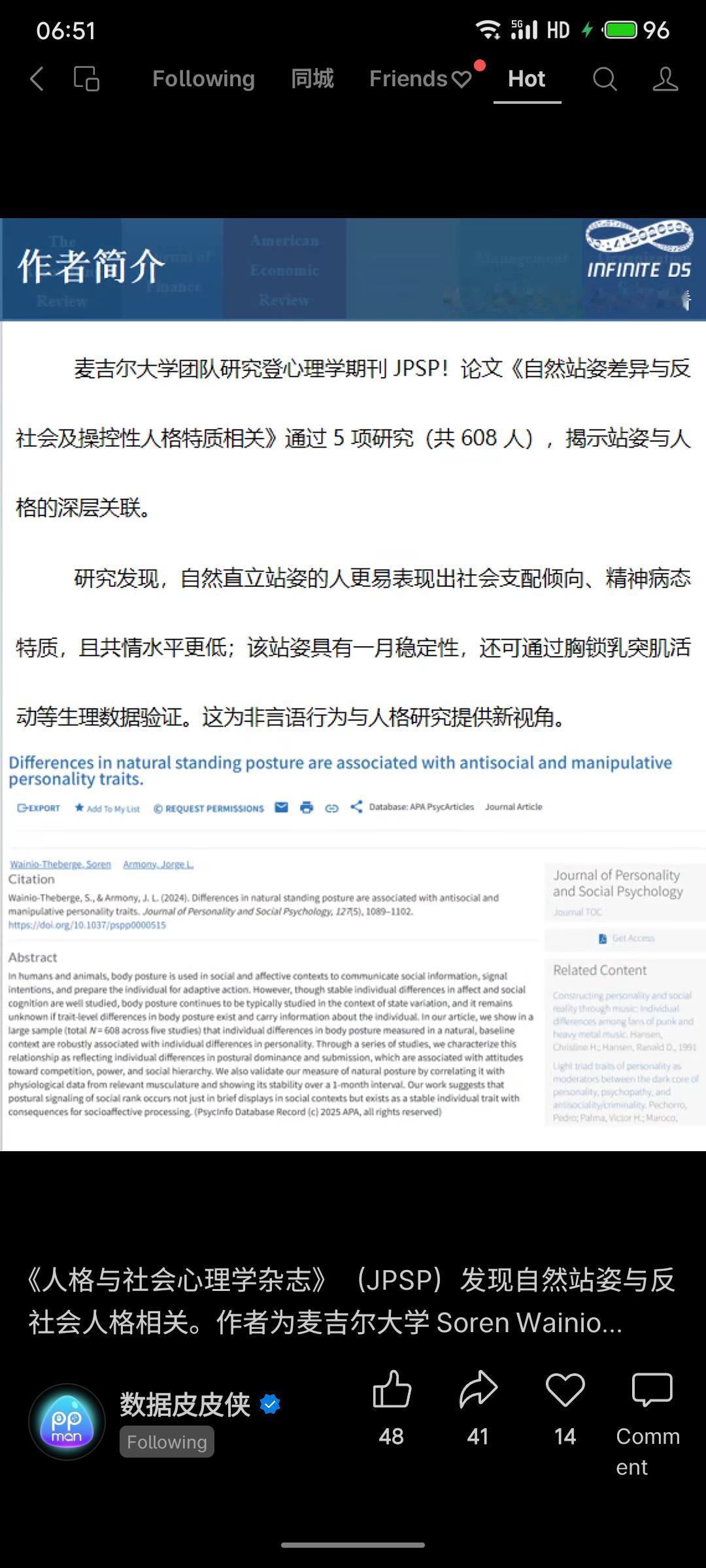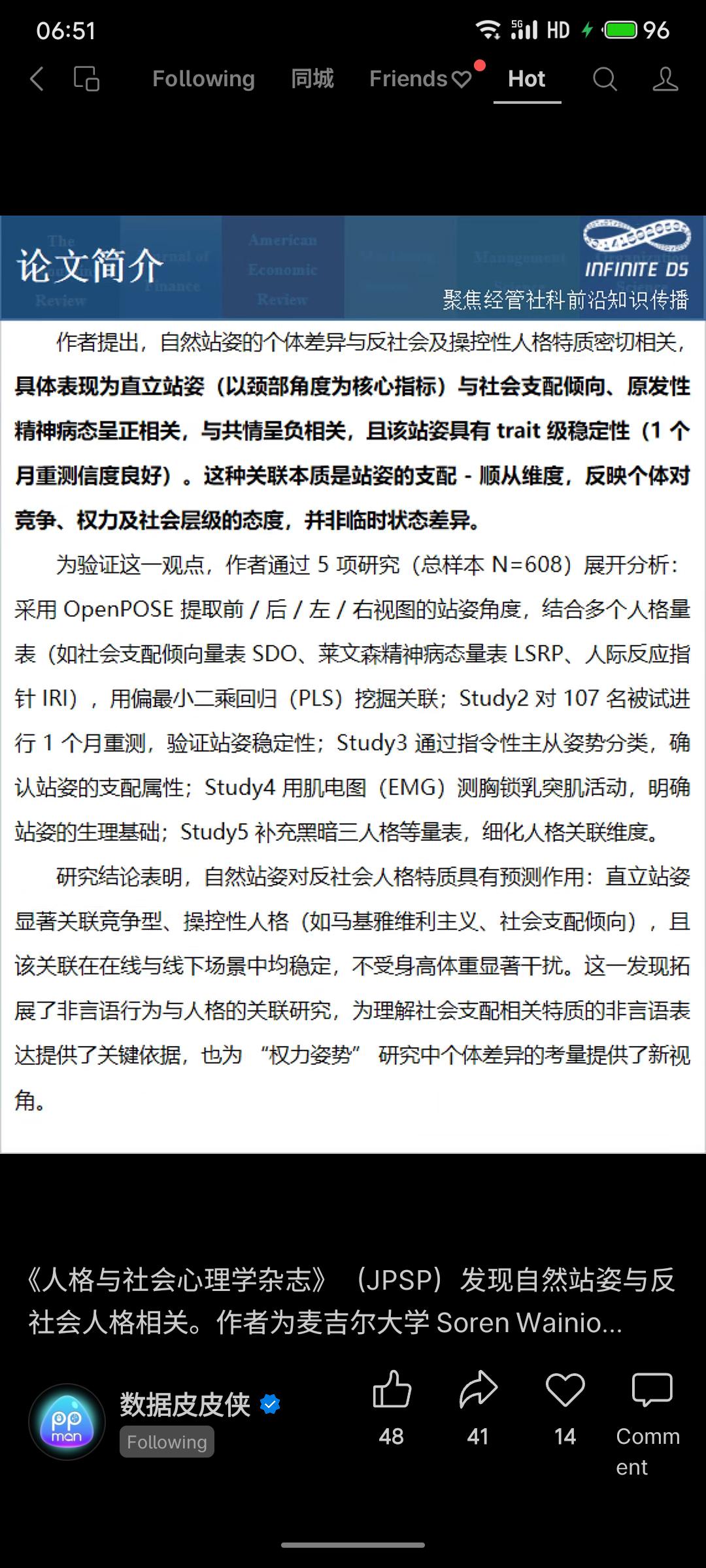 麦吉尔大学研究发现,自然直立站姿与社会支配倾向、精神病态等人格特质显著相关,且具跨时间稳定性。该成果发表于《人格与社会心理学杂志》,为非言语行为与人格关联提供了新证据。
