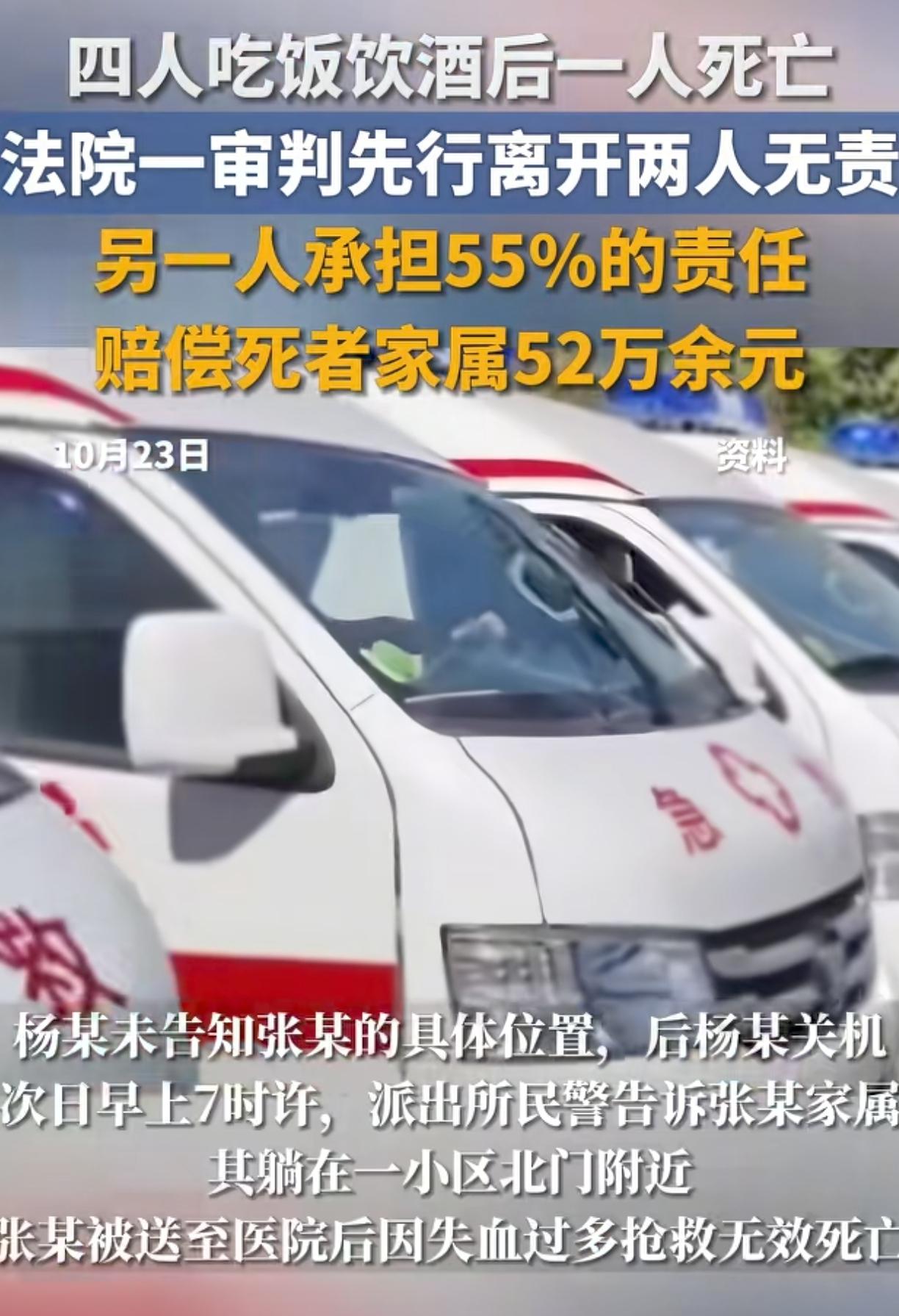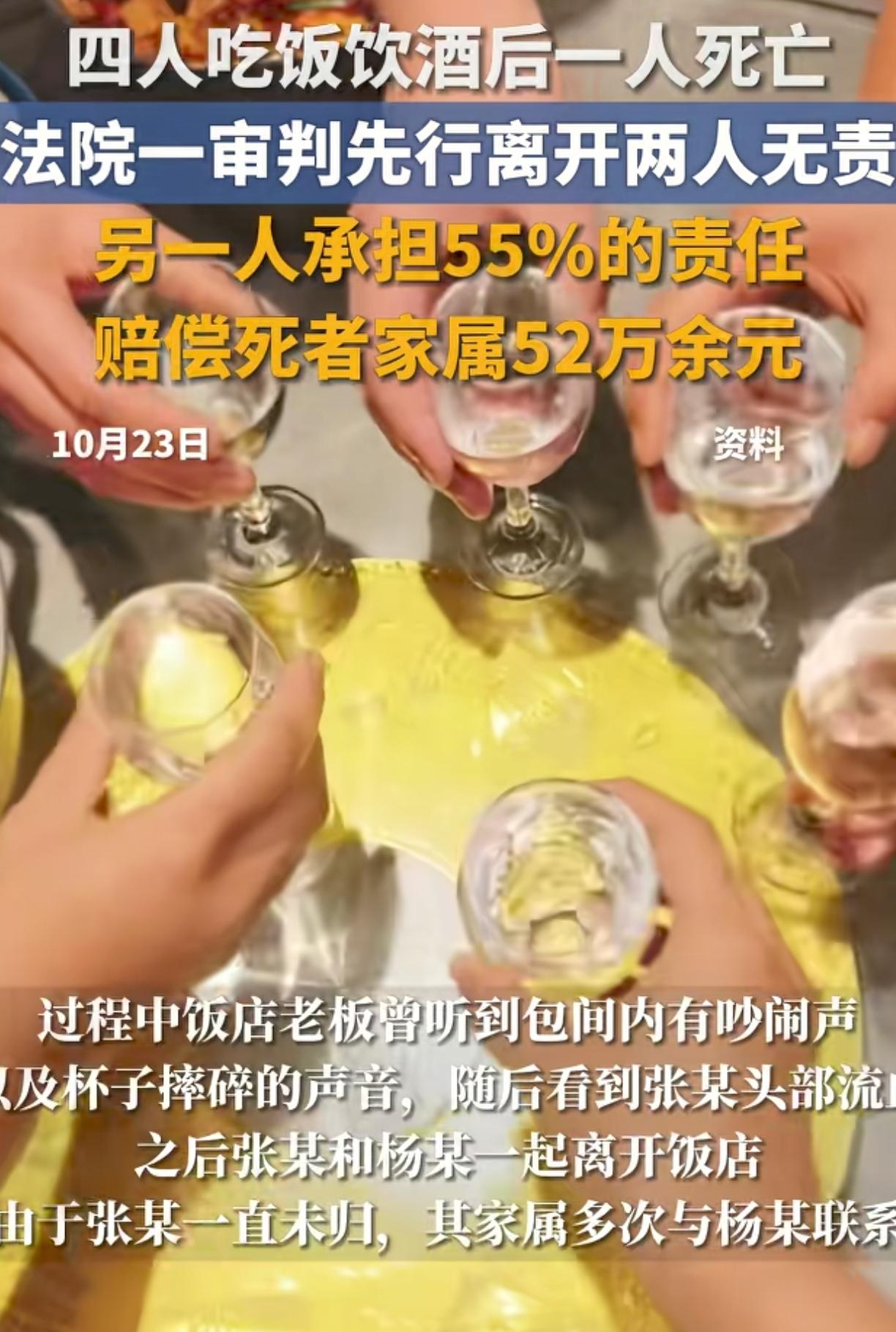戒酒!戒酒!戒酒! 4人相约吃饭喝酒致一人死亡案判了 前面走了的两人无责,最后一起喝酒的这哥们赔52万多,承担55%的责任,其实这案子已经不仅仅是过量喝酒致死,但喝酒占了很大一部分,还有一部分就是酒后暴脾气打架,两人喝多了之后,在包间里置气干了起来,老板听到有吵闹声,摔杯子的声音,离开饭店时张姓男子头部受伤流血,两人离开饭店后,张某妻子和家人打电话给杨某,杨某拒接,还关机,导致受伤严重的张某没有及时得到医治,最终流血过多死亡。 网友总结的好到位“一个不喝先离开,一个不适后离开,一个喝到永远离开,一个绝不离开的来买单”,真是给大伙提了个醒,以后吃饭先走,一不用买单,二不用担责,虽然可能没朋友了,但也不用买单和担责,挺好! 但怎么说呢,都是成年人喝酒,喝出事自己也是要负担一部分的,所以说这个案件,张某担责45%,也很公正。 所以说成年人喝酒要有量,不要去劝酒,也不要去做酒蒙子,现在出台的相关酒文化的法律,大家还是以此为戒比较好。 其实这起事件让人共情的还有一个点,普通人一起喝酒都要担责,那和于一起喝酒的那些人怎么判,这些人为什么就不发出来了呢?