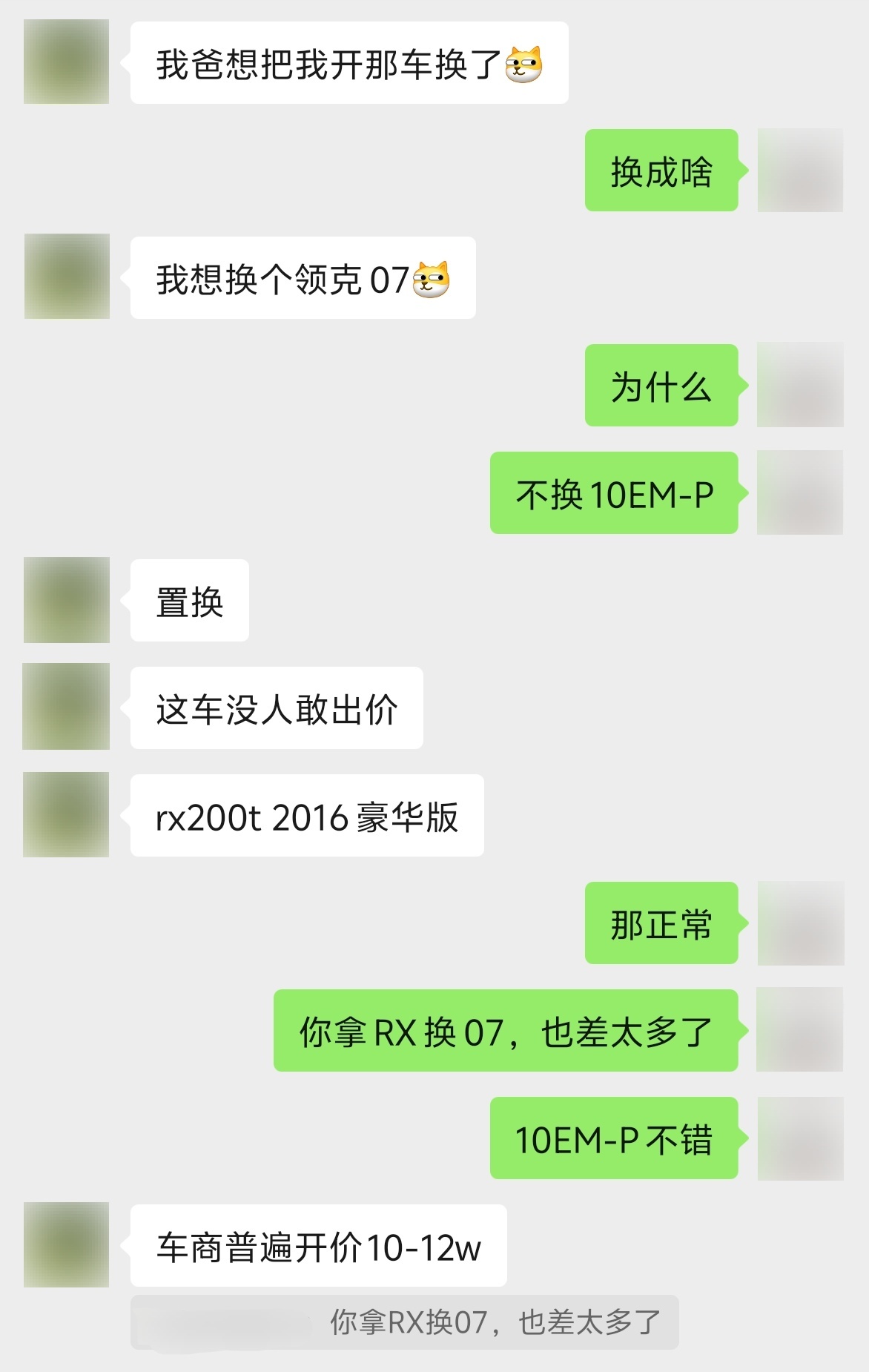 有个哥们儿,他爸想把他的雷克萨斯RX换了,他说想换成领克07EM-P。我问他为