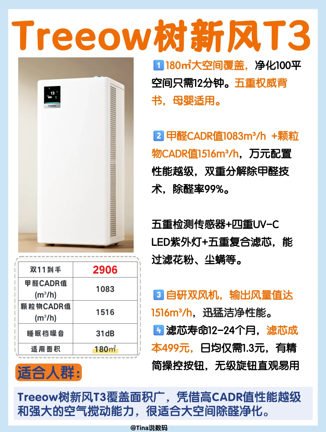 适合别墅/大平层/开放式空间/商用办公,180㎡大空间覆盖,净化100平空间只需12分钟。五重权威背书,母婴适用。