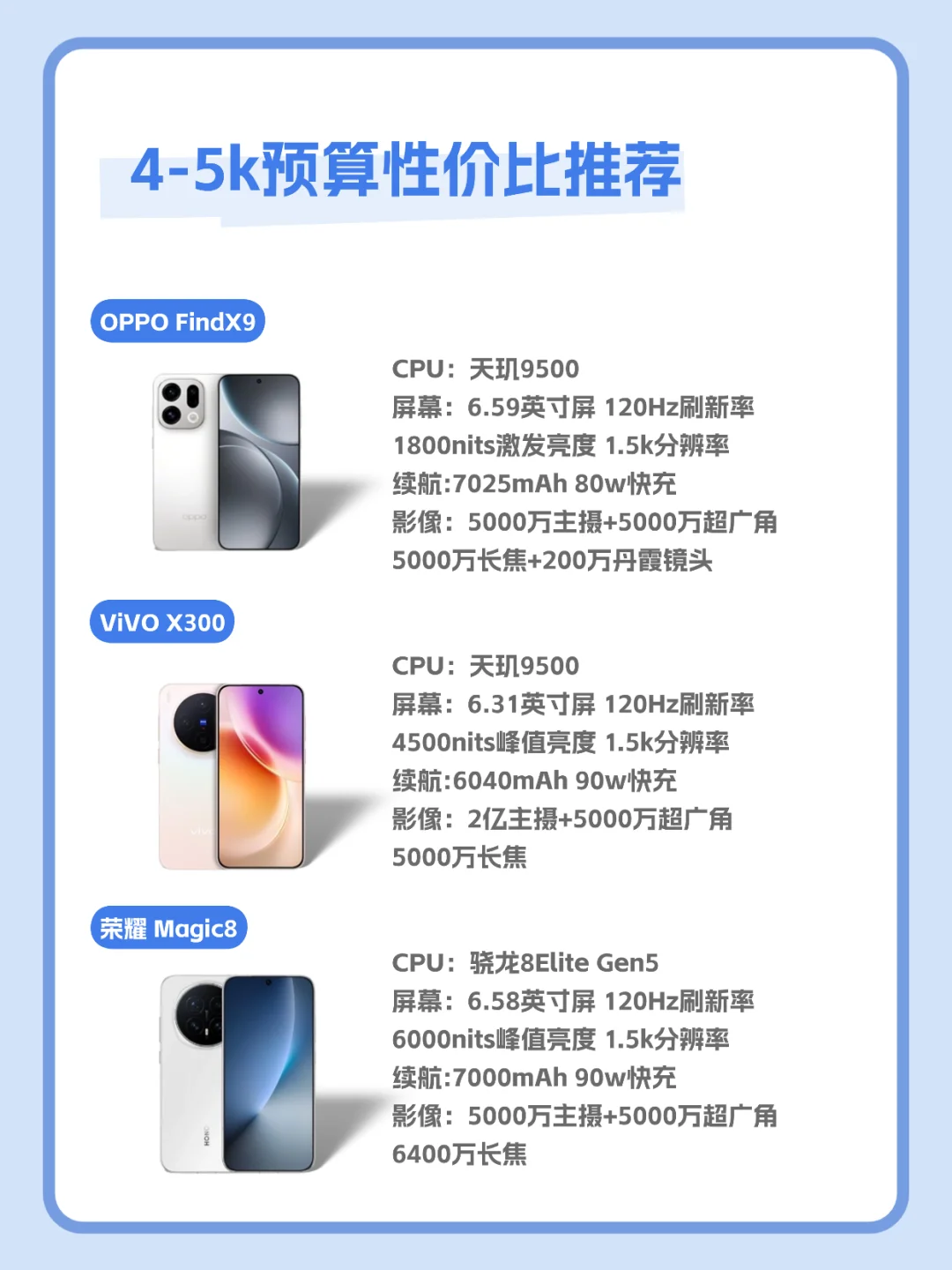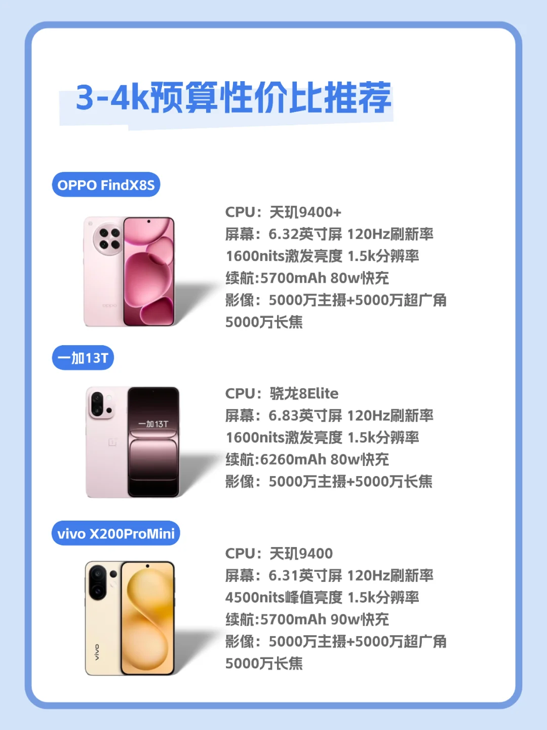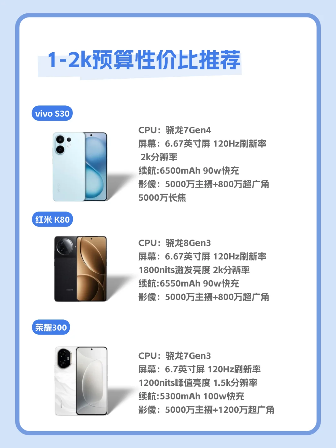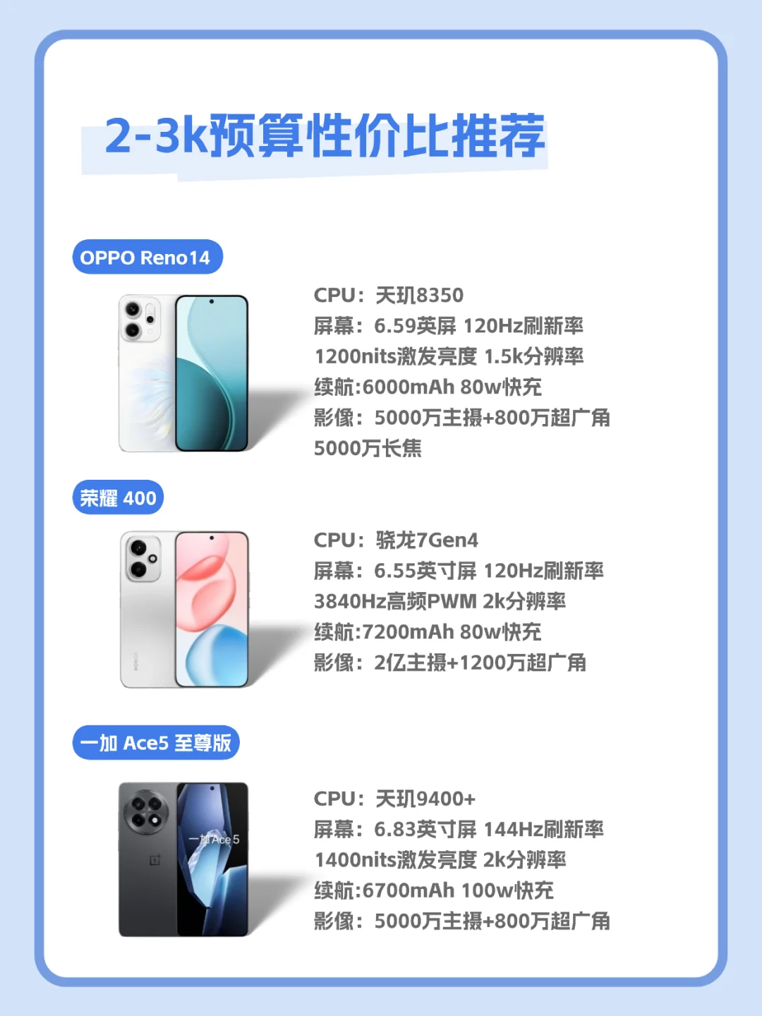 Hello各位 好久不见 最近双十一在即想必各位学弟学妹们可能会有换手机的打算今天理工男就为大家准备了一期各价位段手机选购指南 所选择手机性价比均为第一要求 其次则是续航 影像 性能等 大家可以参考一下哦~1-2k价位vivoS30 红米K80 荣耀3002-3k价位OPPOReno14 荣耀400 一加Ace5至尊版 3-4k价位OPPOFindX8S 一加13T vivoX200ProMini4-5k价位OPPOFindX9 vivoX300 荣耀Magic8——好啦各位 本期的内容就到这里结束啦 欢迎大家在评论区留下预算和需求 一对一为大推荐~