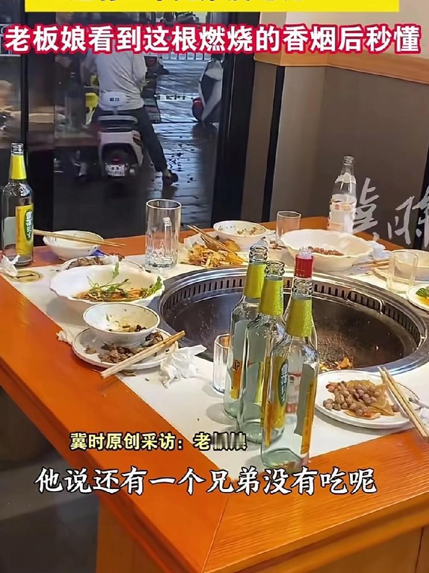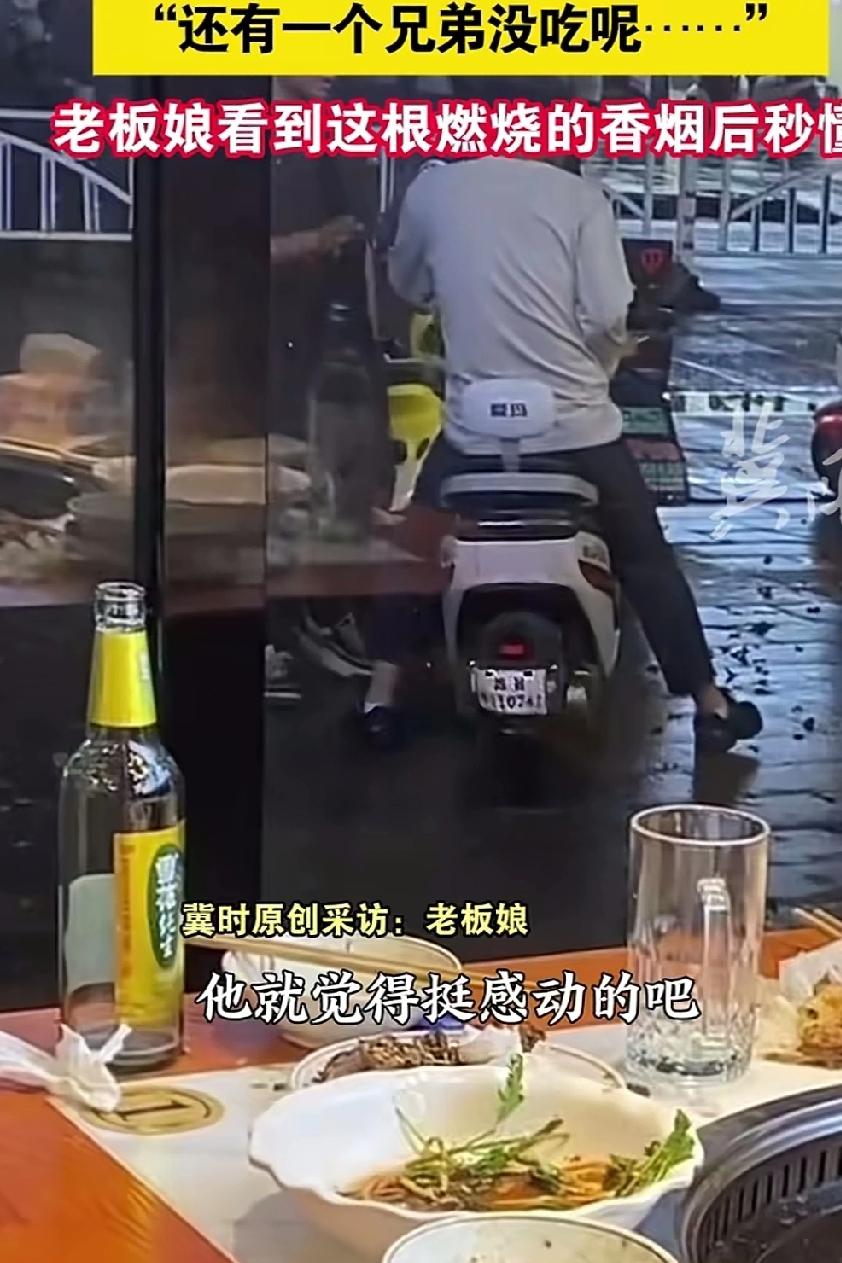 泪目!离世后还能被惦记! 三个好兄弟相约去饭店聚餐,桌上摆满了酒菜几人边喝边聊话语中充满了伤感,饭后结完账要求老板5分钟后再收集,“还有一个兄弟没吃呢”当三兄弟走出门口时,老板这才看到坐位上放着燃烧的香和以及点燃的香烟,老板瞬间秒懂感动落泪!又有多少人离世后仍被惦念,饭桌上留有逝者位置为他点燃一支烟,哪怕是个空白也好。 愿这份挚深至爱的友情永远保留在他们心中!