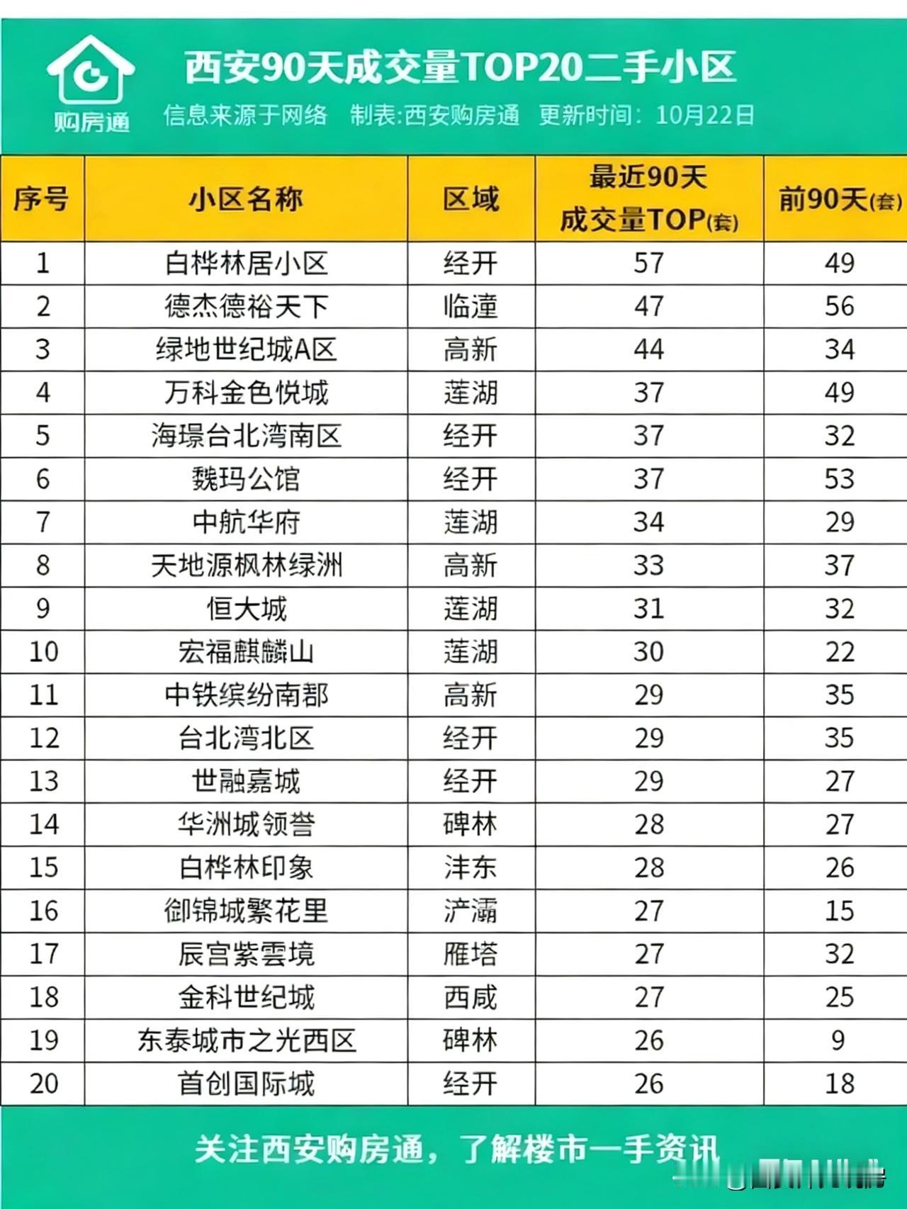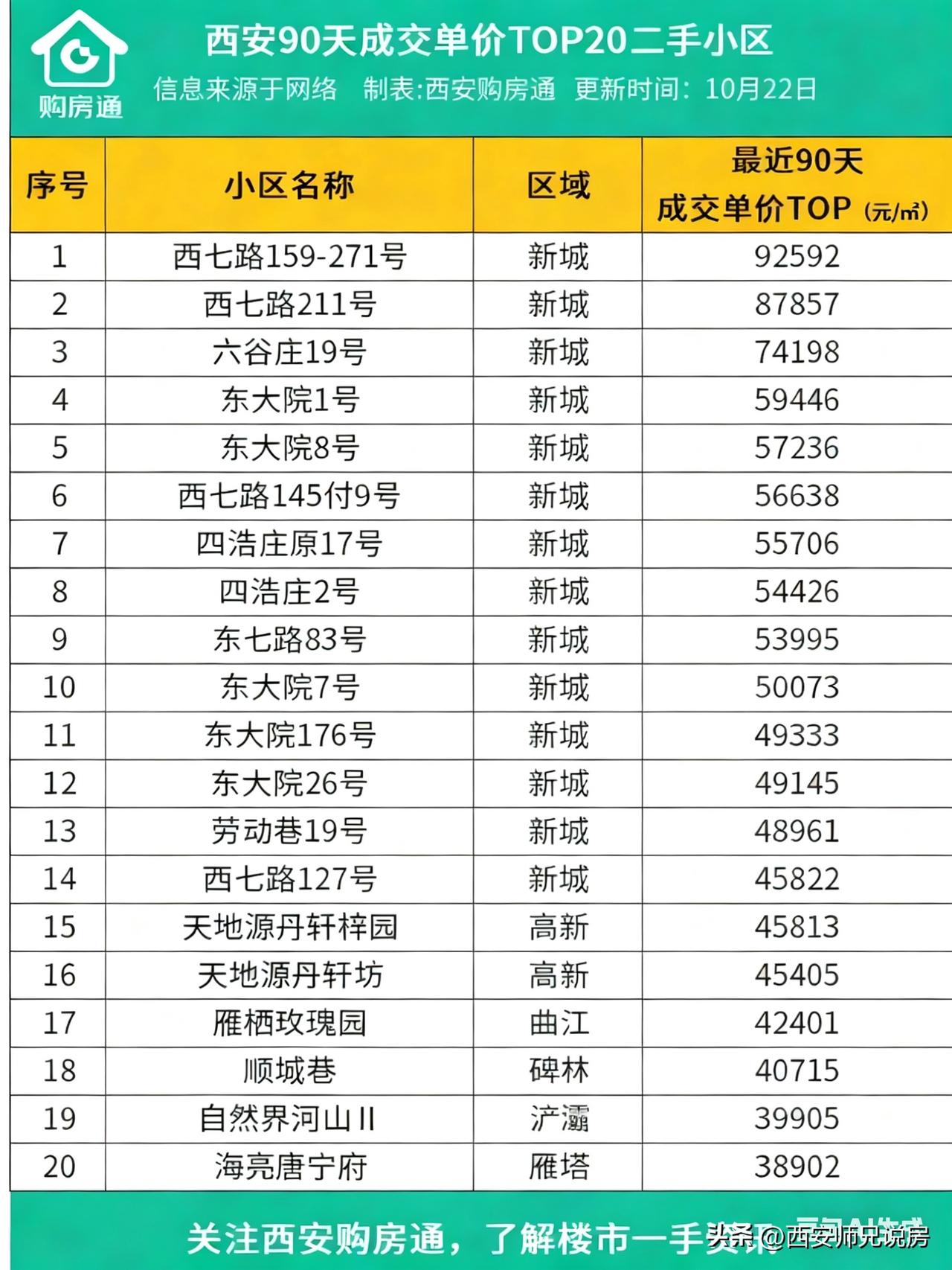 从这两张图可以看出西安二手房近期的真实情况! 一、成交单价维度分析 从西安90天成交单价TOP20二手小区来看,新城区占据绝对优势,前14名中有13个小区位于新城,成交单价最高的西七路159-271号达到92592元/㎡,其余如西七路211号、六谷庄19号等也都在45822元/㎡以上。这表明新城区的二手房在单价上具有很强的竞争力,可能是因为该区域具有优质的教育资源、成熟的配套设施或历史文化底蕴等因素,使得其二手房价值较高。 而其他区域如高新、曲江、碑林、浐灞、雁塔等也有小区进入榜单,不过单价相对新城区较低,最高的天地源丹轩梓园为45813元/㎡,最低的海亮唐宁府为38902元/㎡。这反映出不同区域的二手房市场价值存在明显差异,新城区在高端二手房市场中表现突出。 二、成交量维度分析 在西安90天成交量TOP20二手小区中,经开区表现亮眼,有白桦林居小区、海璟台北湾南区、魏玛公馆、台北湾北区、世融嘉城、首创国际城等多个小区上榜,其中白桦林居小区成交量最高,达到57套。此外,莲湖区、高新区也有不少小区进入榜单,如万科金色悦城、中航华府、恒大城等。 从区域分布来看,成交量较高的小区分布较为分散,涵盖经开、临潼、高新、莲湖、碑林、沣东、浐灞、雁塔、西咸等多个区域。这说明西安二手房市场的成交活跃度在不同区域都有体现,购房者的选择较为广泛,不同区域都有其吸引购房者的特点,如经开区可能因产业布局、居住环境等因素受到青睐,高新区可能因科技产业和优质配套吸引购房者。 三、综合分析 • 区域分化明显:在成交单价上,新城区一枝独秀;在成交量上,经开区表现突出,其他区域也各有亮点。这种分化反映了西安不同区域的发展定位、配套设施、产业布局等因素对房地产市场的影响。 • 市场需求多元:既有对高单价、高品质二手房有需求的群体,也有注重成交量、追求性价比或区域配套的购房者,市场需求呈现多元化的特点。 • 发展潜力各异:新城区在高端二手房市场的优势可能使其在未来的市场中继续保持一定的地位;经开区等成交量活跃的区域,随着区域发展的不断推进,其房地产市场可能还有进一步的发展空间;而其他区域也可根据自身的特点,如发展产业、完善配套等,提升房地产市场的吸引力。西安房价 西安楼市 西安二手房 西安师兄说房 (提示:图片数据来源于西安购房通,仅供参考!)