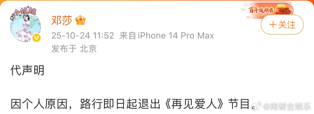 路行退出再见爱人5邓莎 路行即日起退出再见爱人节目 今日,代发声明,称“因个人原因,路行即日起退出《再见爱人》节目”。