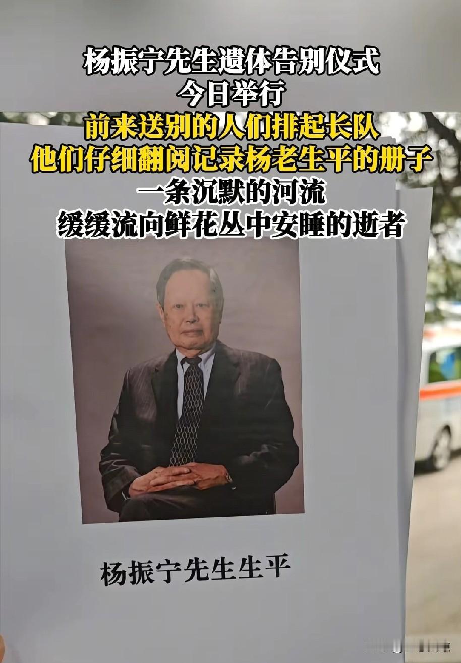 教授的遗体告别仪式于今日举行,殡仪馆外前来送别的队伍一眼望不到尽头。大家怀着沉痛的心情,送别这位伟大的物理学巨擘。 中华民族正是因为有这些杰出之士,在关键时刻勇毅担当、挺身而出,才铸就了如今的中国。吾辈当自强,为民族复兴注入磅礴力量! 杨振宁