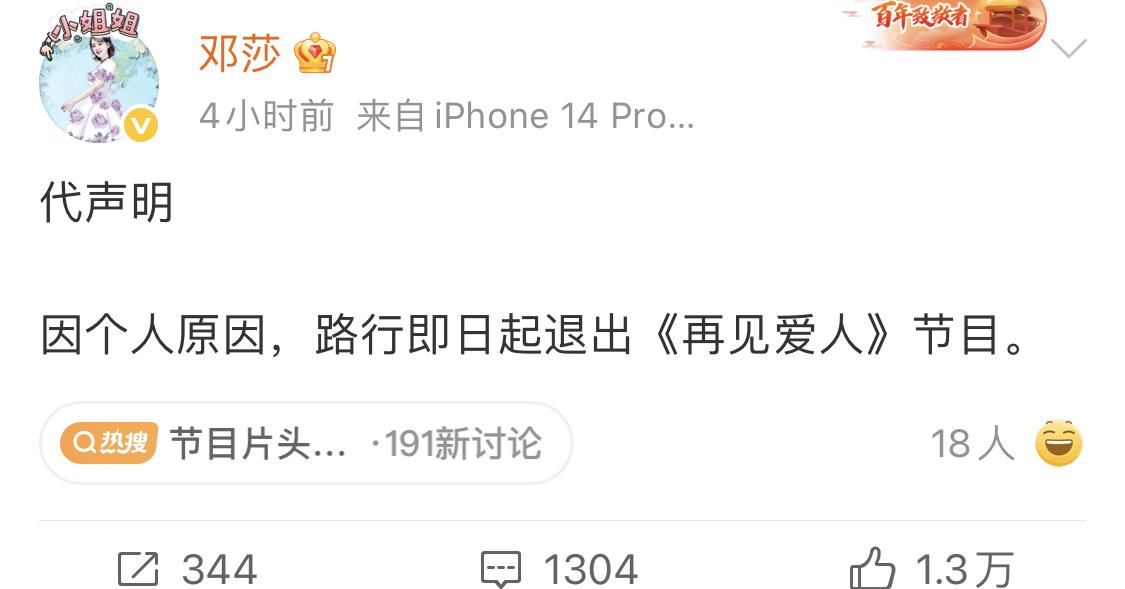 为啥是路行一个人退出?邓莎不退吗? 再见爱人 不是夫妻互相再见么?邓莎一个人玩什么?真是应了邓莎节目上说的:干啥都是一个人。 路行此前也说了没想到会被选上的,没想到娱乐圈这么不专业会放他上去。 这两口子是会预言的,路行以前是北京的一个银行的行长,后来是成了民营企业家,在体制内待过。他们这种人最怕被扒,能陪邓莎上热门综艺也算真爱了吧…… 邓莎