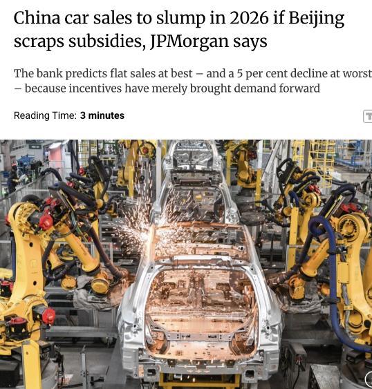 外媒:据摩根大通预测,如果中国取消对购车者的现金补贴和税收优惠,2026年中国汽车销量可能会下滑,打破连续六年增长的态势。 往好了说,销量可能跟今年打个平手;要是情况不如预期,销量说不定比今年少 3% 到 5%。 这预测不光算上了燃油车,连一直涨得挺猛的电动车也包含在内,说电动车明年增速会掉到 15%,比今年预计的 27% 低了一大截。 想知道这说法站不站得住脚,得先说说眼下的购车补贴到底有多实在。 2025 年国家出台的补贴政策力度不小,其中以旧换新是重头戏:报废旧车换新能源车能补 2 万块,换 2.0 升以下的燃油车也能补 1.5 万;就算是旧车转让置换,补贴也有一万多块。 光这一项政策,截至 2025 年 5 月底,申请量就达到 412 万份,单看 5 月份私人购车的群体里,近七成的人都享受到了这份补贴。 新能源车的购置税更是全免,买辆 30 万的车能省两万多,这政策到 2025 年底就到期了,2026 年要改成减半征收,而且每辆车减免的税额还有 1.5 万元的上限。 除此之外,还有贷款贴息、消费券这些优惠,算下来能给消费者省不少钱 —— 比如贷款 10 万分 3 年还,最多能省 3000 块利息;买车发票金额不一样,还能领到 1000 到 4000 块的消费券。 这些真金白银的补贴可不是走过场,实实在在把汽车销量托了起来。 2025 年前三个季度,国内汽车产销已经连续五个月保持同比 10% 以上的增速,9 月份单月产销更是头一回突破 300 万辆,前三季度总销量都到 2436.3 万辆了。 八部委之前发布的稳增长方案里还提过,2025 年力争全年销量达到 3230 万辆左右,从目前的势头看,这个目标并不难实现。 新能源车尤其亮眼,前三季度卖了 1100 多万辆,占总销量的 46.1%,这要是没购置税全免和置换补贴,肯定涨不了这么快。 要知道 2020 年新能源车的渗透率才 5.4%,短短五年就冲到现在的水平,政策在其中的推动作用,明眼人都能看出来。 其实早有先例能说明补贴和销量的关系。2015 年搞燃油车购置税减半,当年销量就涨了 10 个点,第二年再涨 17 个点,多卖了 340 万辆;2022 年同样的政策,一个月就带动乘用车销量涨了近 40%。 新能源车更不用说,2024 年卖了 1150 万辆,占比 42.3%,要是没有购置税减免,很多消费者可能还在犹豫观望。 现在要是把这些优惠撤了,消费者买车成本上去了,下手自然会更谨慎,毕竟谁的钱都不是大风刮来的。 所以摩根大通的预测不是瞎猜的。先看燃油车,这几年本来就不好过,2024 年销量比前一年降了 8.6%,占市场的比重都不到 60% 了。 要是 2025 年底以旧换新政策到期,那些就等着补贴才打算换车的消费者,很可能会把计划搁置 —— 少了一万多的补贴,对买 10 到 20 万价位燃油车的人来说,影响真不小。 而且国七排放标准预计 2027 年实施,不少消费者可能会等着买更符合标准的车型,这无疑会进一步拖累 2026 年的销量。 说燃油车之前,先看看电动车的情况。虽然预测还能涨 15%,但比今年的 27% 慢了不少,主要还是因为补贴退坡了 ——2026 年购置税从全免变减半,省下来的钱比之前少了一半。 不过好在电动车本身越来越能打了:现在主流车型续航都能超 600 公里,动力电池成本比几年前降了不少;全国公共充电桩已经超过 300 万台,车和桩的比例优化到 2.3:1,里程焦虑没那么严重了。 加上 L2 级辅助驾驶已成标配,智能座舱这些配置也很吸引人,就算补贴少了,还是有不少人愿意买,只是增速会慢下来。 这么一来,2026 年整体销量就有点悬了。燃油车下滑的幅度,可能没法靠电动车的增长完全补上,所以才会有下滑 3% 到 5% 的说法; 但要是电动车卖得比预期好,或者车企自己跟进搞优惠,说不定就能跟今年持平。 不过也不用太担心会崩,毕竟现在汽车市场的底子比以前厚多了。 2024 年自主品牌已经占了乘用车市场 60% 以上的份额,比亚迪、吉利这些企业技术越来越强,还能靠出口拉一把 ——2024 年中国汽车出口量飙升到 585.9 万辆,同比涨了 19.3%,连续两年稳居全球第一。 而且行业一直在淘汰落后产能,2025 年产能利用率达到 84.2%,不是盲目扩张的状态,扛得住市场波动的底气更足了。 补贴本来就是阶段性的政策,目的是帮新能源汽车打开市场、促进行业升级。 现在新能源车的市场渗透率眼看就要摸到 50% 的门槛,产业链也成熟了,确实到了慢慢退出补贴的阶段。摩根大通的预测其实是在提醒市场,政策退坡后,得靠市场自身的力量往前走。