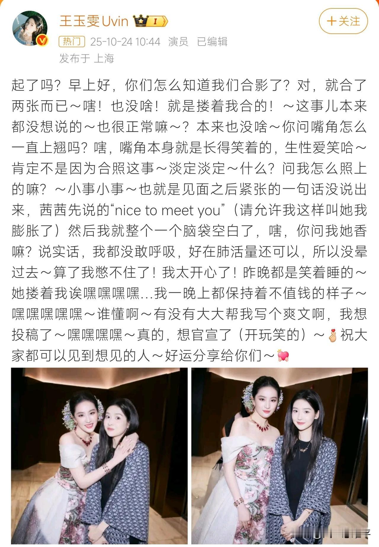 王玉雯想和刘亦菲官宣了 王玉雯追星成功,在VOGUE时尚盛典后台见到了自己的偶像刘亦菲。见面时,王玉雯紧张到大脑一片空白,精心准备的英文问候词忘了个精光,好在刘亦菲主动用英文打招呼,还温柔地搂住她合影。王玉雯情商 王玉雯综艺 王玉雯公主裙