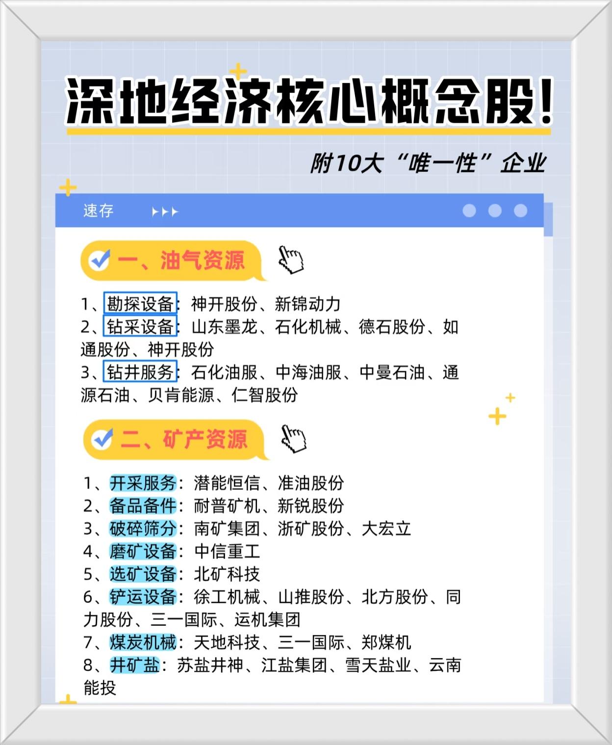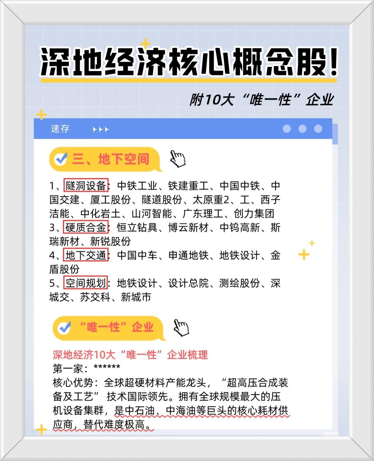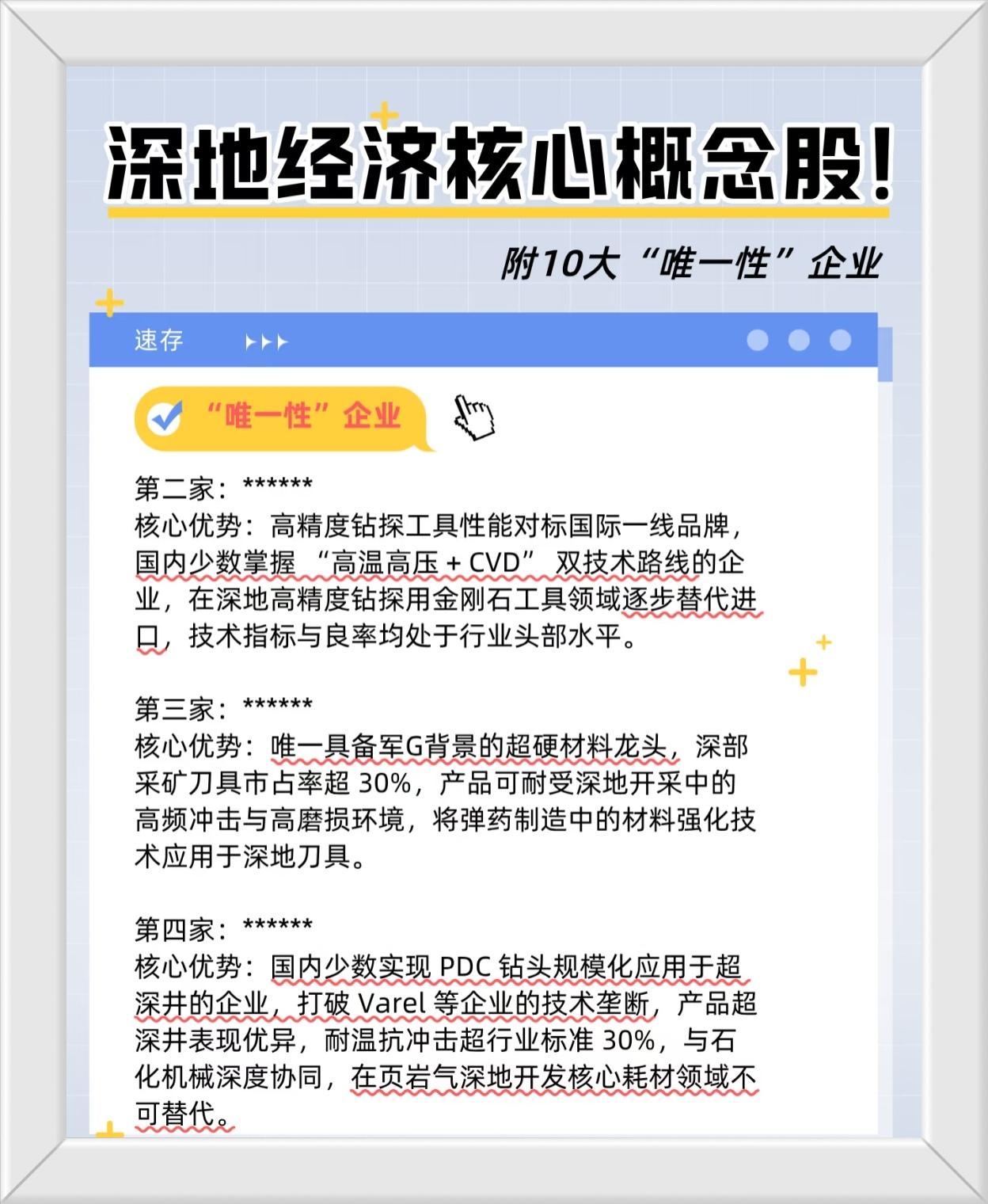 “深地经济核心概念股”及相关“10大‘唯一性’企业”信息的全面整理与总结: 一、整体主题:深地经济迎来万亿级爆发机遇 核心聚焦于“深地经济”这一新兴战略领域,强调其在国家资源开发、能源安全、地下空间利用等方面的重要地位,指出该领域正迎来“万亿级爆发”。突出“深地经济核心”概念,这些企业在各自细分领域内具备技术领先、市场独占或不可替代的优势。 二、深地经济核心概念股分类梳理 (一)油气资源类企业 涉及勘探设备、钻采设备、钻井服务三大方向,具体包括: - 勘探设备:神开股份、新锦动力 - 钻采设备:山东墨龙、石化机械、德石股份、如通股份、神开股份(重复) - 钻井服务:石化油服、中海油服、中曼石油、通源石油、贝肯能源、仁智股份 这些企业为油气深地勘探与开采提供基础设备与服务支持,是深地能源开发的重要上游环节。 (二)矿产资源类企业 涵盖从开采到加工的多个关键细分领域,包括: - 开采服务:潜能恒信、准油股份 - 备品备件:耐普矿机、新锐股份 - 破碎筛分:南矿集团、浙矿股份、大宏立 - 磨矿设备:中信重工 - 选矿设备:北矿科技 - 铲运设备:徐工机械、山推股份、北方股份、同力股份、三一国际、运机集团 - 煤炭机械:天地科技、三一国际、郑煤机 - 井矿盐:苏盐井神、江盐集团、雪天盐业、云南能投 这些企业覆盖了矿产深地开采的完整设备与耗材供应链,从基础工具、耐磨部件到大型机械,体现了深地矿产开发对高端装备的高度依赖。 (三)地下空间类企业 围绕“地下工程与空间利用”展开,包括: - 隧洞设备:中铁工业、铁建重工、中国中铁、中国交建、厦工股份、隧道股份、太原重工、西子洁能、中化岩土、山河智能、广东理工、创力集团 - 硬质合金:恒立钻具、博云新材、中钨高新、斯瑞新材、新锐股份 - 地下交通:中国中车、申通地铁、地铁设计、金盾股份 - 空间规划:地铁设计、设计总院、测绘股份、深城交、苏交科、新城市 此部分体现了深地经济在基础设施建设、城市地下空间开发、交通与规划领域的广泛应用,特别是硬质合金等关键材料,在深地钻掘与耐磨部件中具有战略意义。 三、深地经济10大“唯一性”企业(重点梳理) 图片特别整理并列举了10家在深地经济领域具备“唯一性”或极强核心竞争力的企业,其中前四家的详细核心优势如下: 第一家(未公开全名) - 核心优势:全球超硬材料产能龙头,“超高压合成装备及工艺”技术国际领先。 - 拥有全球规模最大的压机设备集群,是中石油、中海油等巨头核心耗材供应商。 - 技术壁垒高,替代难度极大。 第二家 - 核心优势:专注于高精度钻探工具,性能比肩国际一线品牌。 - 国内少数掌握“高温高压 + CVD”双技术路线的厂商,在深地高精度钻探用金刚石工具领域逐步实现进口替代。 - 技术指标与产品良率处于行业领先水平。 第三家 - 核心优势:唯一具有军G背景的超硬材料龙头企业。 - 其深部采矿刀具市场占有率超30%,产品专为应对深地开采中的高频冲击与高磨损环境而设计。 - 创新性地将弹药制造中的材料强化技术移植应用到深地刀具制造中,显著提升产品性能与耐用性。 第四家 - 核心优势:国内少数能实现PDC钻头(聚晶金刚石复合片钻头)规模化应用于超深井的企业之一。 - 打破了国际企业如Varel在该领域的技术垄断。 - 产品表现出众,耐温性与抗冲击能力超出行业标准30%。 - 与石化机械行业深度合作,在页岩气深地开发核心耗材供应方面占据不可替地位。 四、总结分析 1. 深地经济是未来国家战略级产业方向,涉及能源安全、资源保障、地下空间开发等多个关键领域,具备万亿级市场潜力。 2. 相关概念股覆盖了从设备制造、材料研发、工程服务到空间规划的完整深地产业链,体现出高度的系统性与技术密集性。 3. 图片特别点名了10家“唯一性”企业,它们在技术先进性、市场独占性、军工背景、不可替代性等方面各具优势,是深地经济爆发中最具投资价值与关注潜力的核心标的。 4. 其中,超硬材料、高精度钻探工具、深部耐磨设备、PDC钻头等细分领域的技术突破与国产替代趋势尤为明显,是深地经济发展的关键支撑。