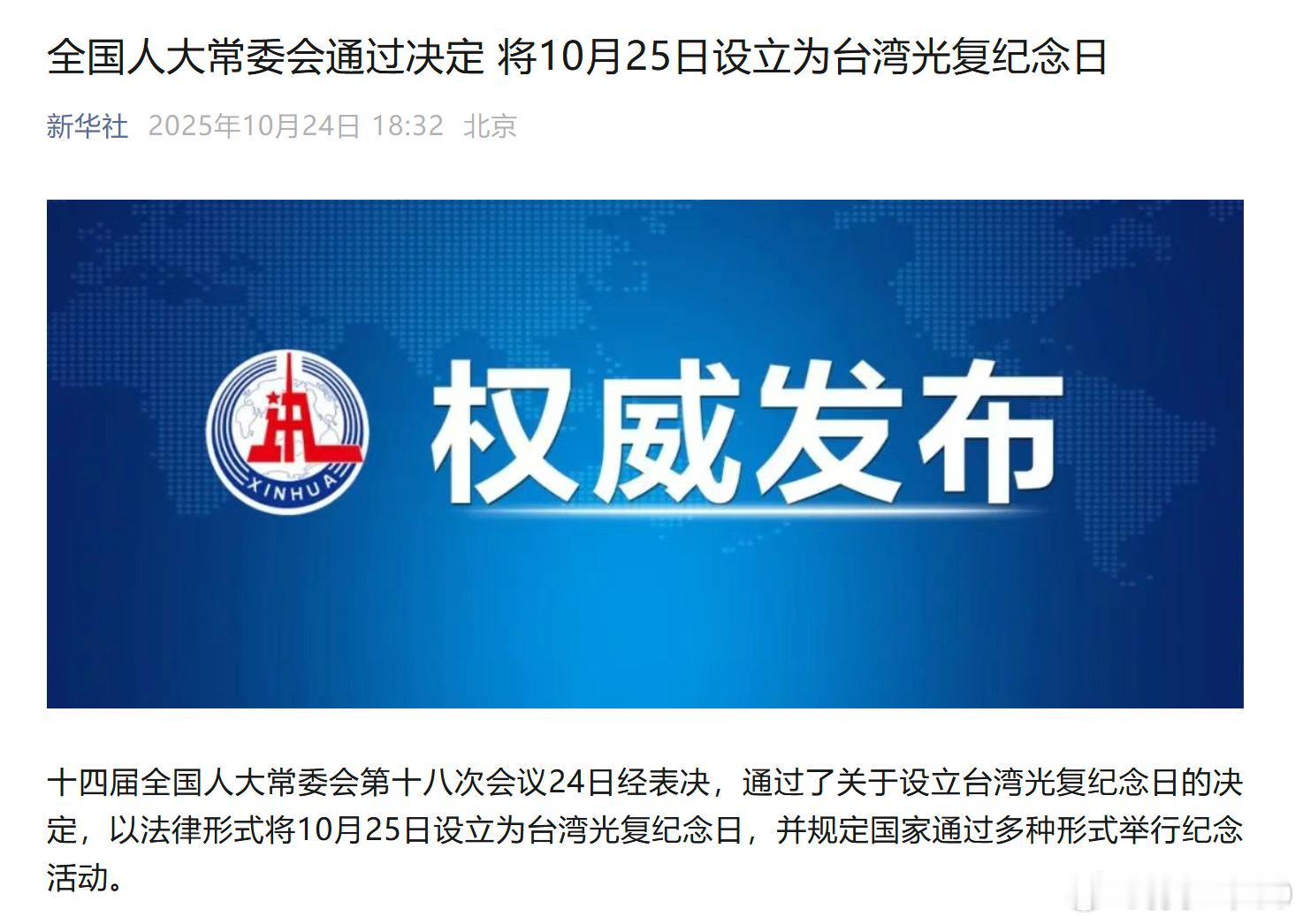 全国人大常委会通过决定,将10月25日设立为台湾光复纪念日