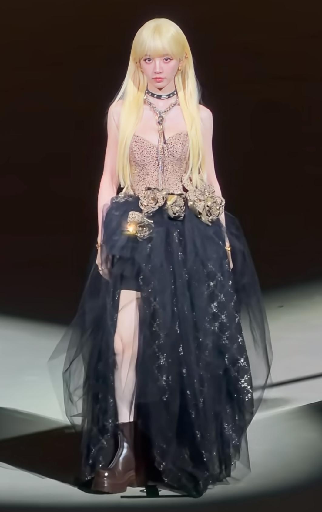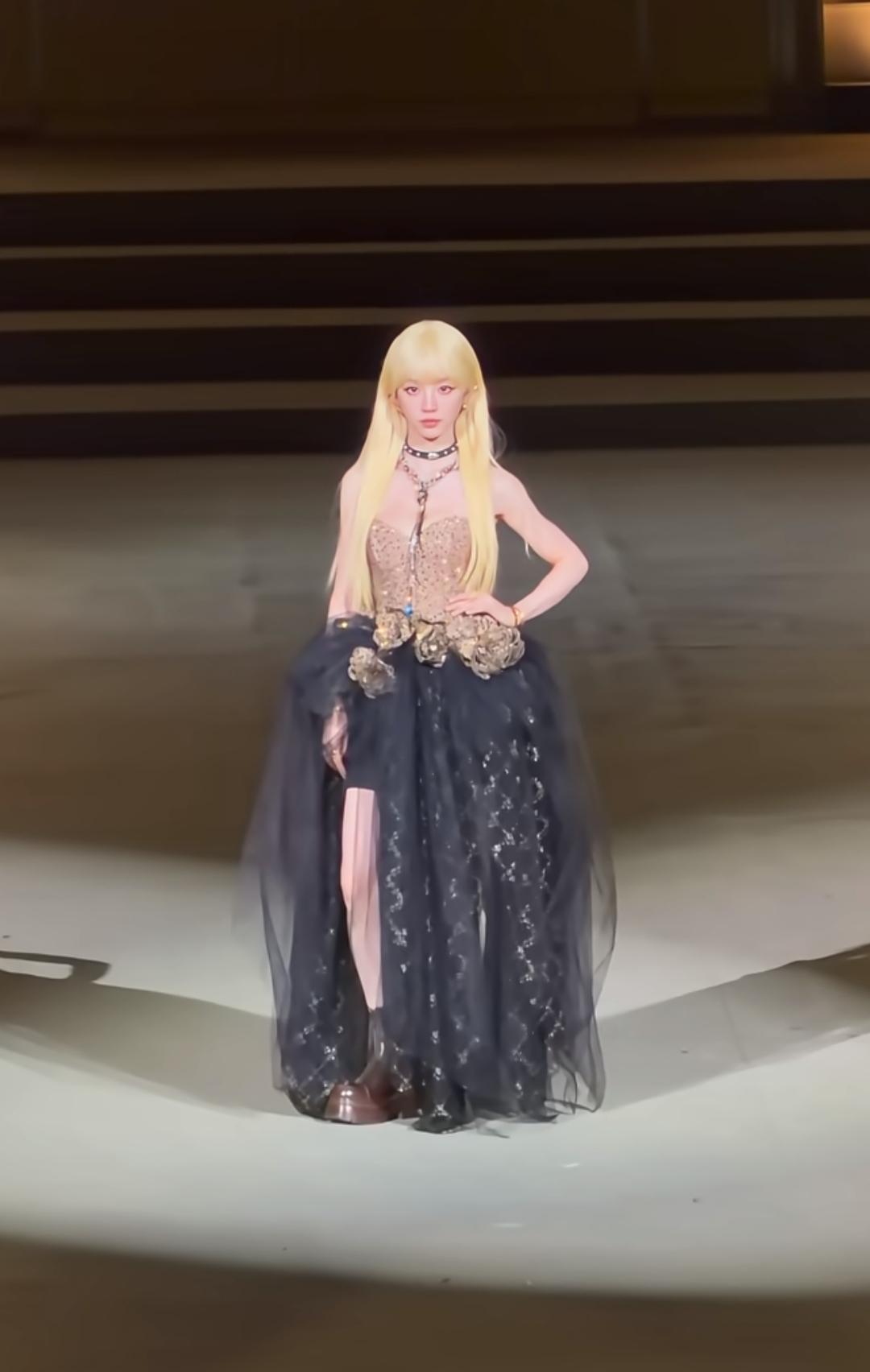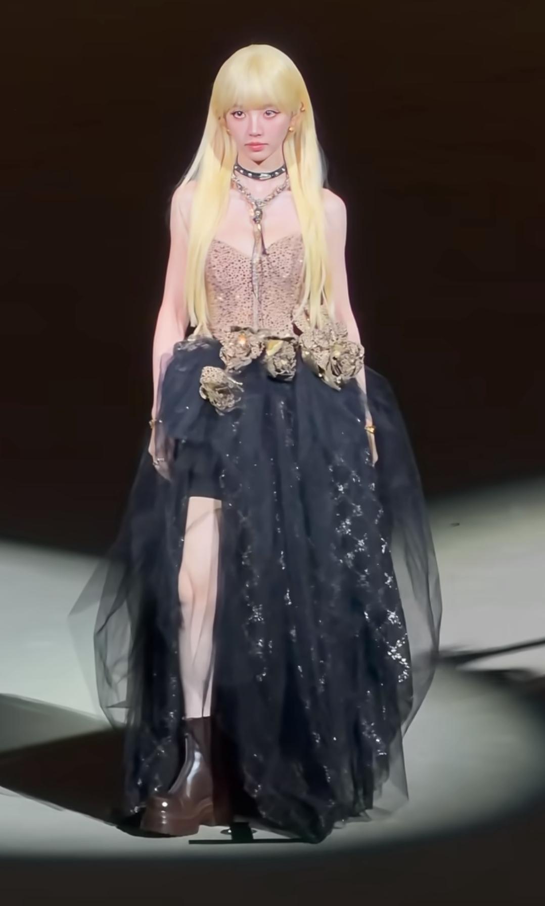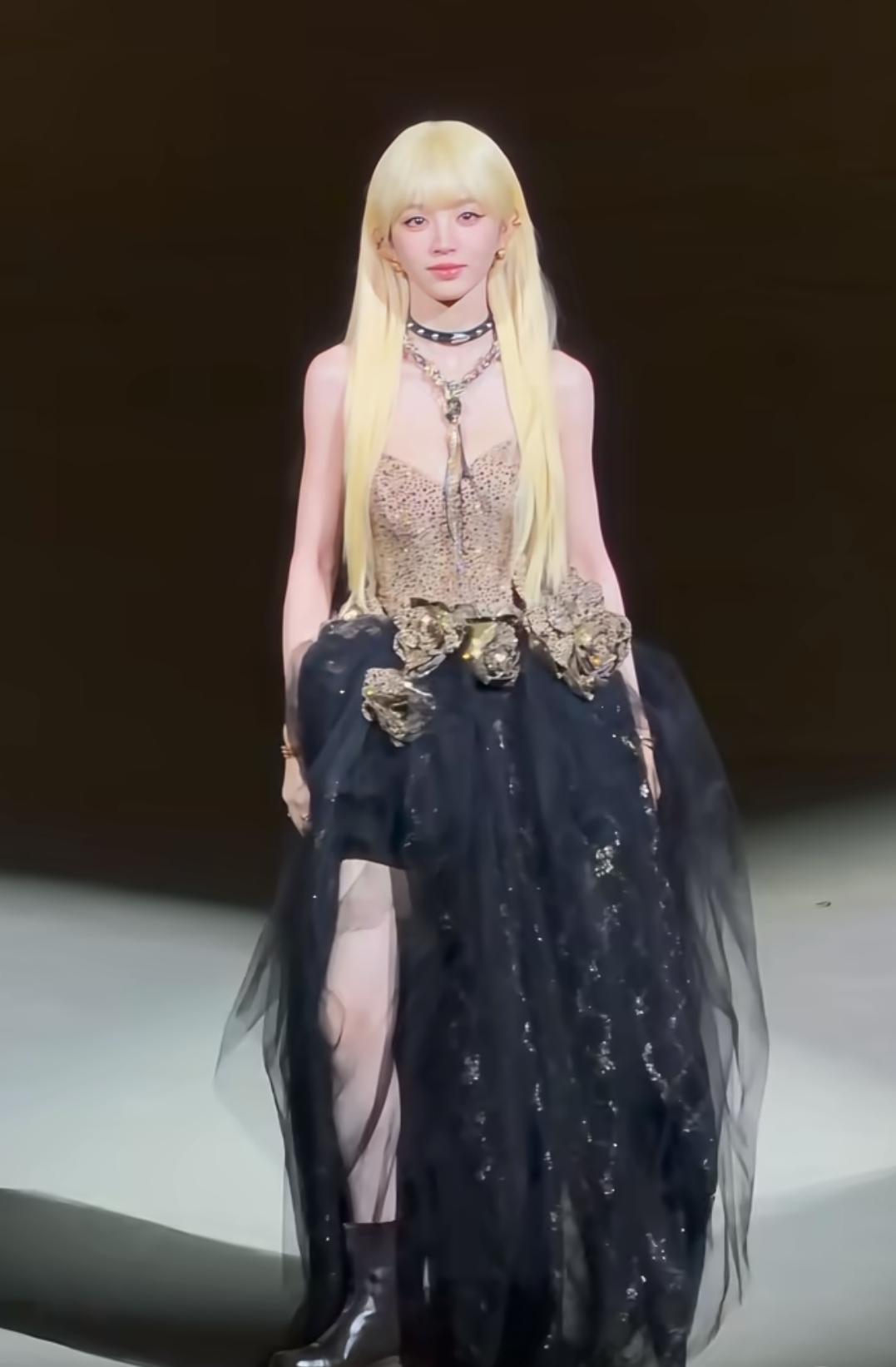 小田好适合cos,我觉得各种颜色的头发在她头上都好好看。 田曦薇这红毯造型直接把“暗黑芭比”焊在身上了!奶金色长卷发裹着齐刘海,圆溜溜的大眼睛一抬,甜妹底子直接撞上冷艳感——吊带紧身衣缀满细碎纹路,腰侧堆着鎏金雕花,像把古堡里的玫瑰别在了裙摆上。 这身造型甜酷反差感直接拉满。她往那儿一站,是迪士尼在逃暗黑公主,也是把“甜妹拽姐”糅得刚好的独一份,是甜得扎眼、酷得勾人的芭比本芭啊!