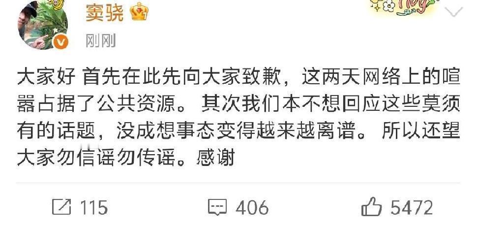 刚刚窦骁发文,他说本来是不想回应,但网络上那些话题都是莫须有的,越传越离谱,只好