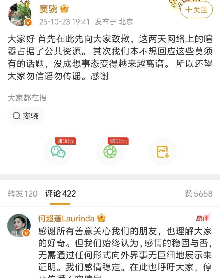 刚刚窦骁发文,他说本来是不想回应,但网络上那些话题都是莫须有的,越传越离谱,只好占用公共资源澄清一下,希望大家不要相信谣言。 这一次窦骁的发声显得颇为无奈。他也不是第一次面对这种流言蜚语了,但看到越来越多的话题与事实相去甚远,他不得不站出来解释清楚。发了声明之后,他合上手机,长长地叹了口气。身旁的何超莲看了看他,拍了拍他的肩膀,宽慰道:“别想那么多,该澄清的咱们澄清,就做好自己该做的事。” 窦骁笑笑没说话,但心里还是有些自嘲。他原本是一个靠演技和努力闯出名堂的演员,如今却因为他的感情生活和另一半的家世频繁成为舆论焦点。无论他怎么低调,外界的质疑和猜测却始终如影随形。他知道这次的事情又让何超莲难受了,便拉着她的手说:“对不起这些事总是牵连到你。”何超莲摇摇头,一脸轻松地说:“我们又没做错什么,清者自清,不用管他们。” 但何超莲越是表现得轻松,窦骁心里反而越不是滋味。他清楚最近网上的传言已经升级到什么程度,甚至把他贬低成了一个只会靠富豪老婆上位的“吃软饭的演员”。婚礼是他亲自筹备的,他想给何超莲一个难忘的时刻,可这些却被解读成他在讨好女方家庭。这些流言真真假假混杂在一起,让人完全分不清楚。 而向太的一些“力挺”言论,也让局势变得更加复杂。有些网友觉得向太是在表达对窦骁的肯定,但也有人认为她的话里暗藏着一些微妙的看法,好像窦骁的存在多少带了些目的性。窦骁对这些议论无法左右,他只能更加努力专注于工作和家庭,用实际行动来证明一切。 晚上,各大娱乐论坛还在热议窦骁的澄清发言,而何超莲那条简单的评论“我们感情稳定”,则再次引发了不同的解读。有人觉得这是何超莲在支持男友,但也有人质疑她在过度“力保”窦骁,甚至开始编造各种内幕故事。这让整个事件有种愈演愈烈的趋势。 当天夜里,窦骁的微信群里,多位好友都来关心他。有些是鼓励的,有些则调侃地问:“难不成你真是靠脸吃饭,豪门女婿的剧本写好了?”窦骁发个苦笑表情道:“行了,咱们都别添乱了,明天我还得进组拍戏呢。”朋友们都是做这行的,自然明白其中的不易,适时点到为止,没有再多说。 第二天一早窦骁便准时出现在片场。可能是昨晚那件事扰乱了心情,他在拍摄时显得有些分心。导演喊了两次卡后语重心长地提醒:“小窦你的那股狠劲呢?别让外边那些乱七八糟的东西影响你,记住,你的实力永远是你最大的武器。”这一番话点醒了窦骁,他深吸一口气,把所有的烦恼摒弃在脑后一心钻入角色之中。 而何超莲则继续过着自己低调的生活,她始终相信,只要彼此信任,再多的非议也不过是云烟。她的父亲何鸿燊固然是注定被提及的存在,但她早就明白,自己和窦骁的爱情,仅属于他们两个人。 两人虽然来自不同的世界,但感情从来不是靠外界定义的。他们心里都清楚,生活不是一场剧本,不必讨人喜欢,做好自己的该做之事,就足矣了