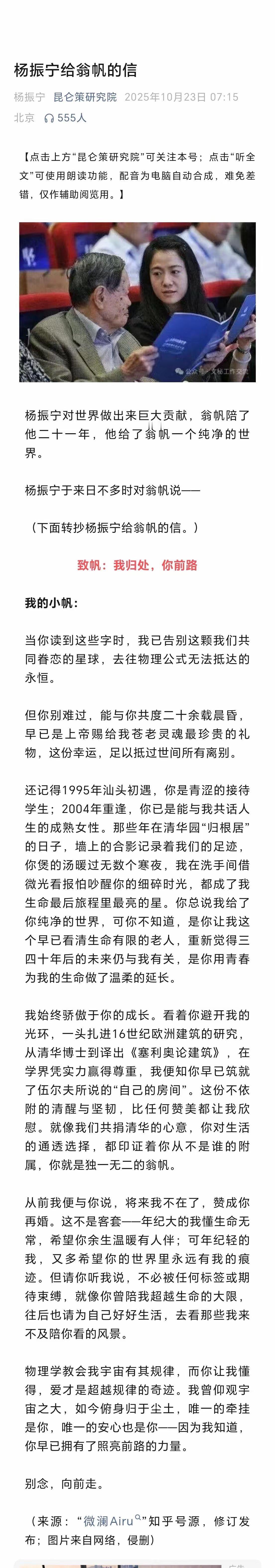 看了杨振宁先生写给翁帆女士的信,我觉得翁帆女士值得了,二十多年的付出,真的值得了。 爱人爱己,先生对翁女士的爱是真情流露,这种爱不同于寻常,而是他们口中真正的罗曼史。 先生希望翁帆女士再嫁,不必在乎世人的眼光,勇敢做自己…… 这句话真的好好。 物理教会我宇宙有其规律,而你让我懂得,爱才是超越规律的奇迹……如今我俯身归于尘土,唯一牵挂的是你,唯一安心的也是你,因为我知道,你早已拥有照亮了前路的力量。