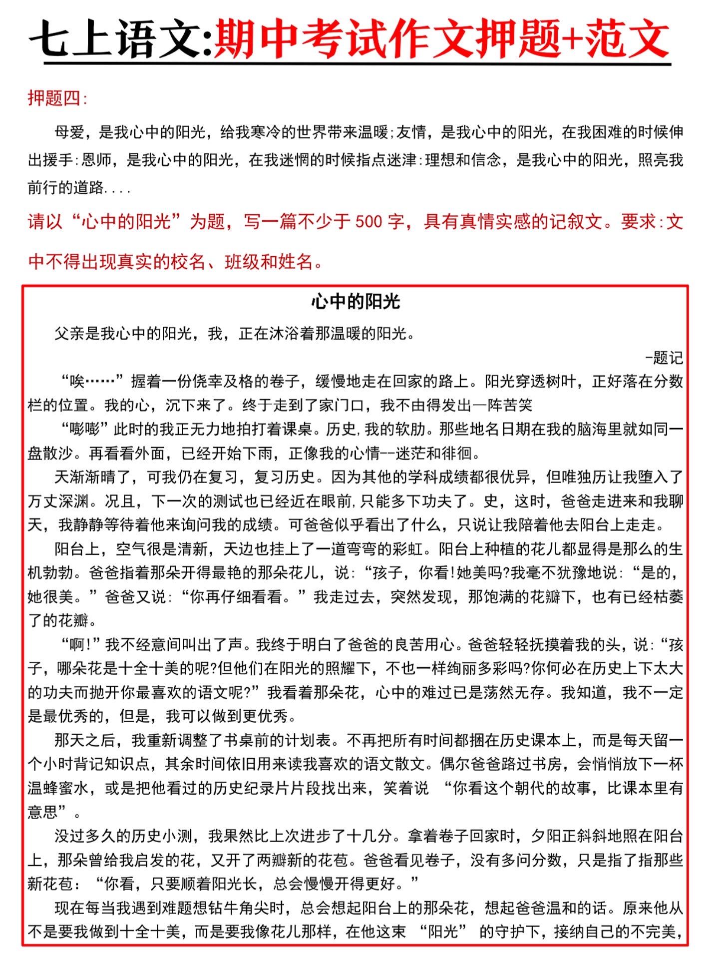 七年级上册语文期中考试作文。七年级上册语文期中考试作文,老师给大家整理出来了。家长给孩子打印一份出来学习,都是考试常考常出题,完整版可打印,快给孩子打印一份出来学习吧!